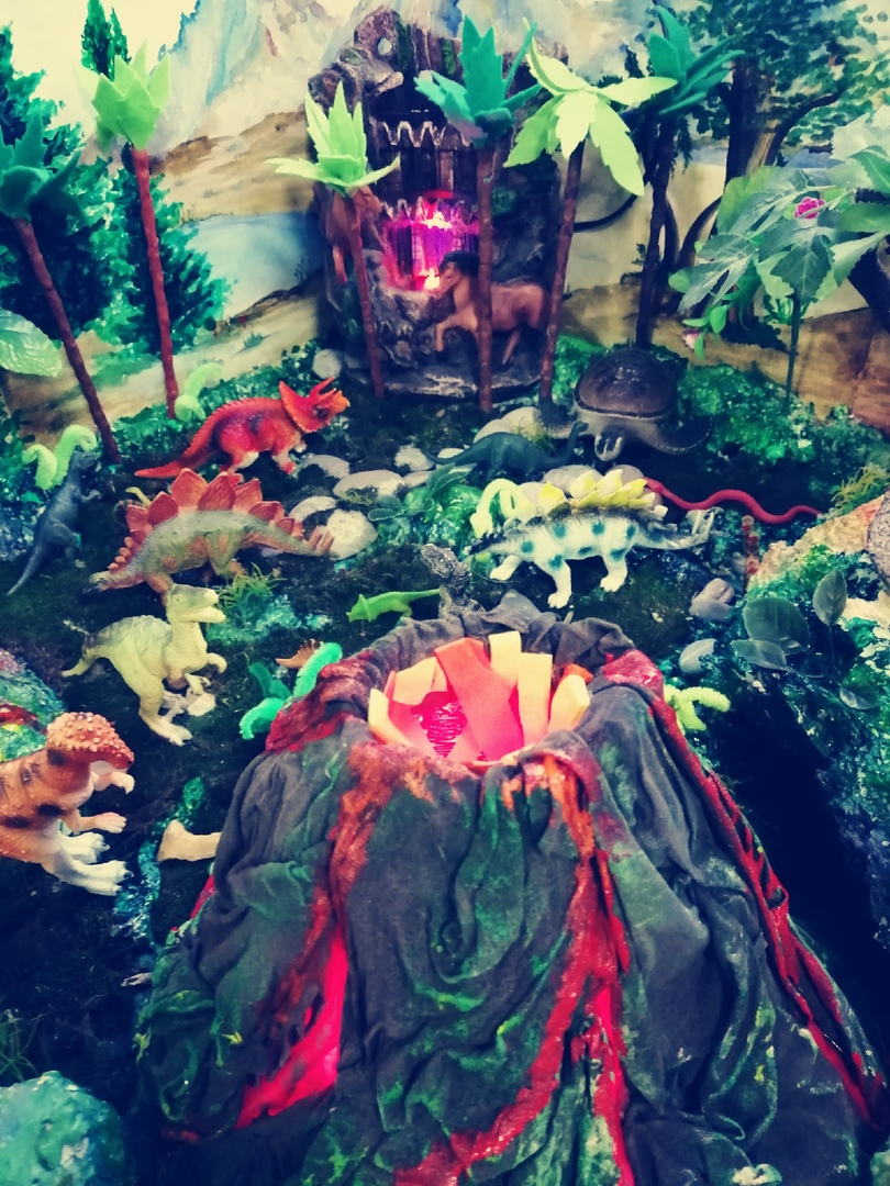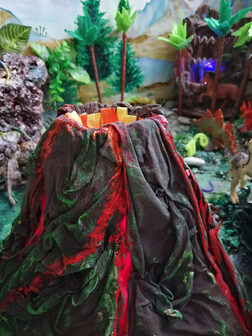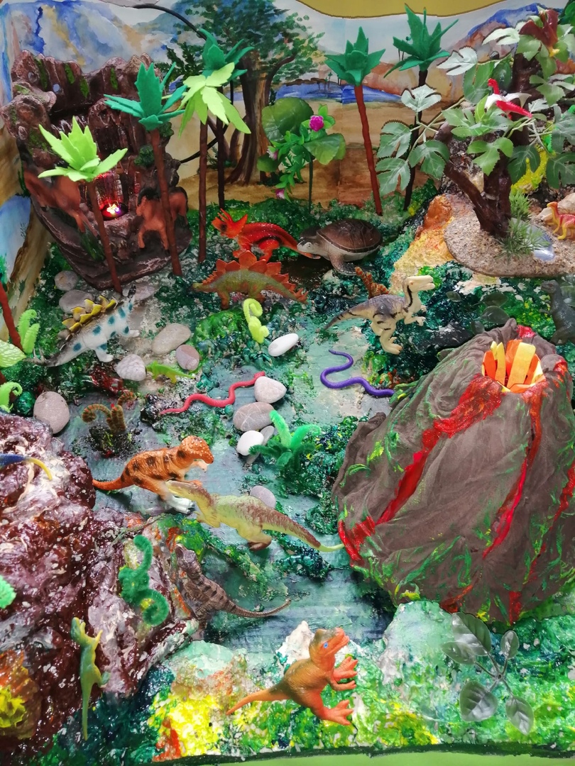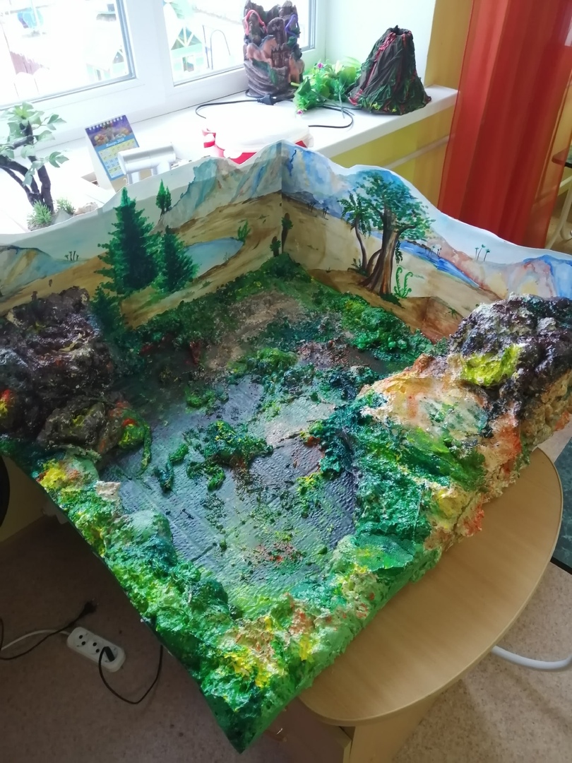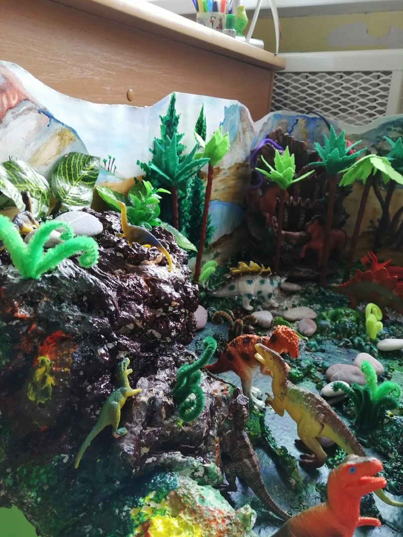 Работа закипела. Мы рисовали, красили, клеили, пенили, резали, сворачивали, крутили, пачкались. Но в результате плодом наших трудов стал макет природы юрского периода, кусочек среды обитания динозавров. Этот макет станет не только прекрасным наглядным пособием, позволяющим окунуться в мир древних ящеров, но и захватывающей «базой» для игр. Теперь среди гор, пальм, папоротников, пещер, камней, наши воспитанники могут играть со своими фигурками, принесенными из дома.