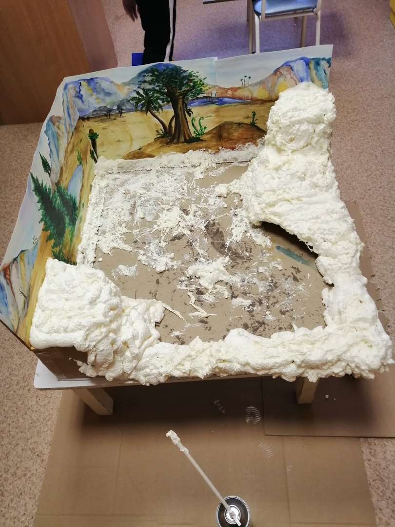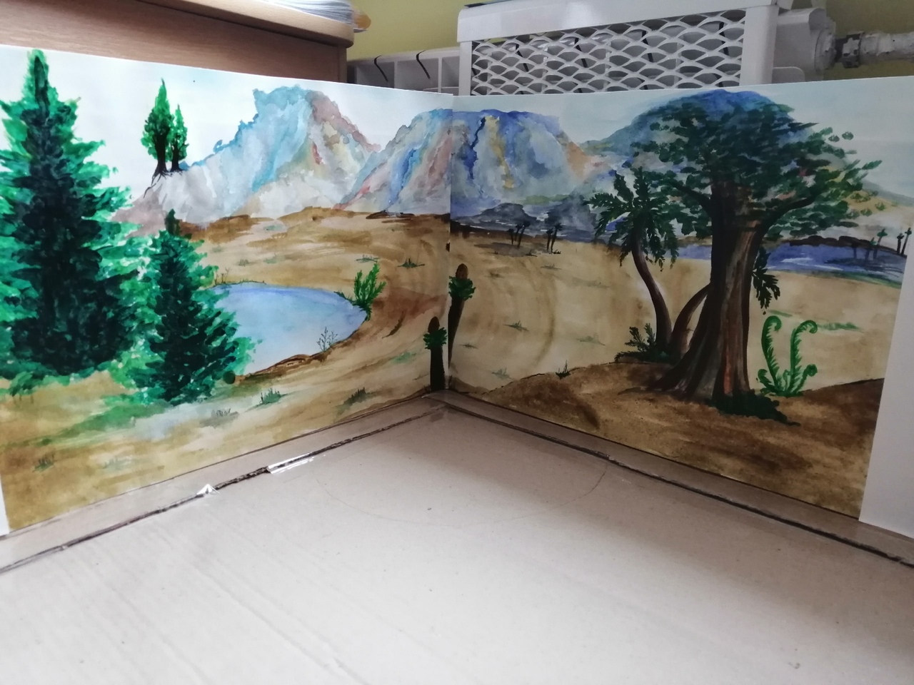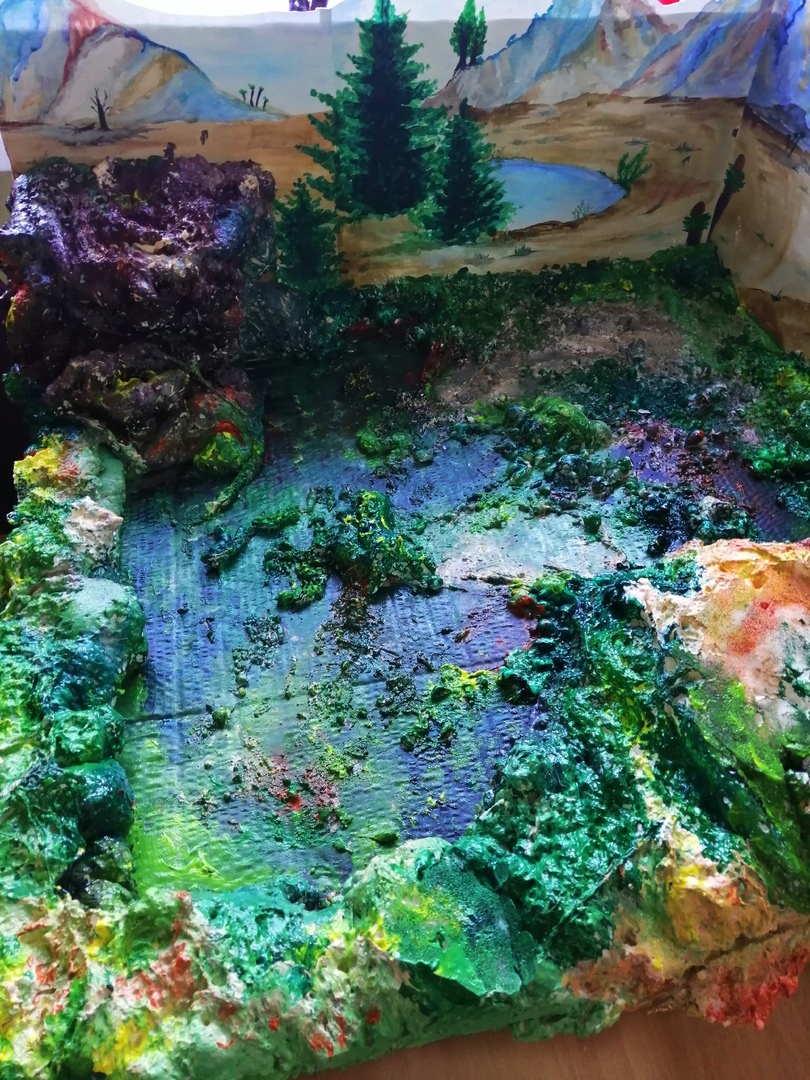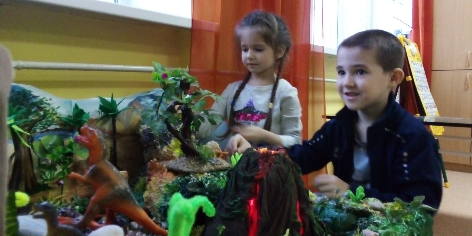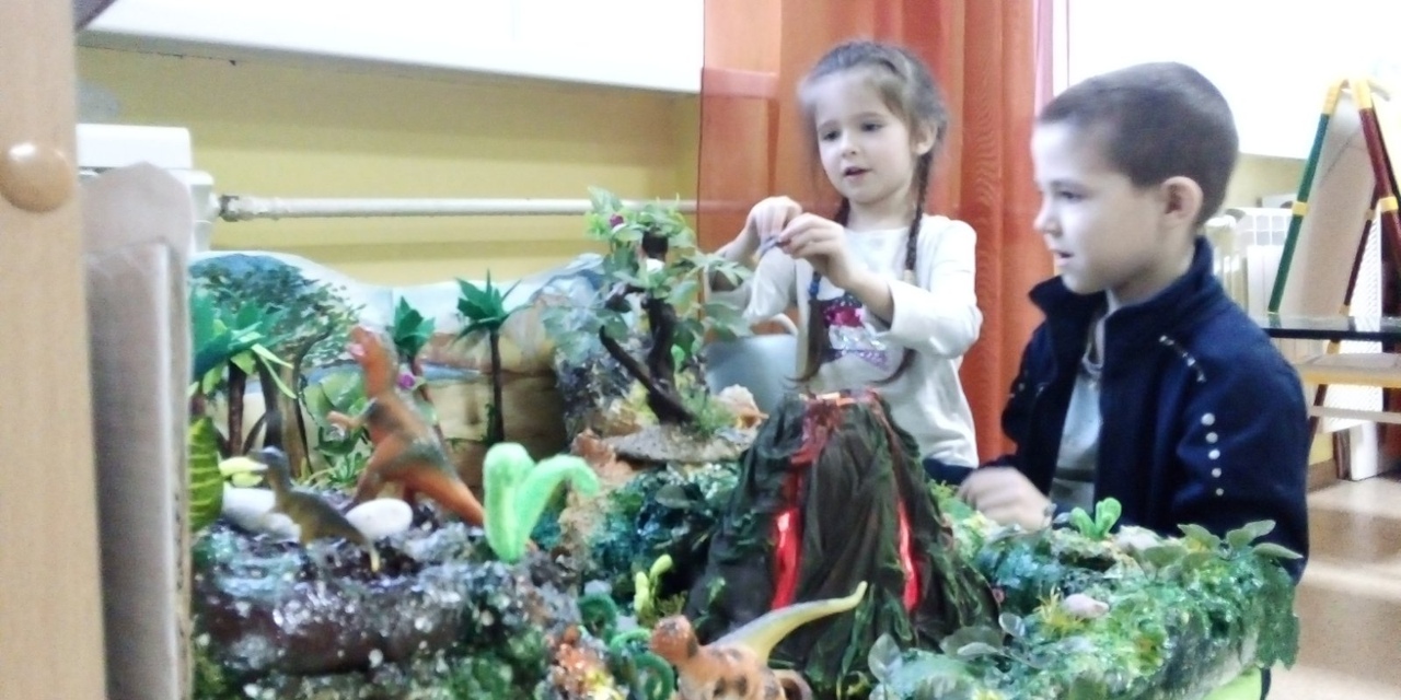 Работа закипела. Мы рисовали, красили, клеили, пенили, резали, сворачивали, крутили, пачкались. Но в результате плодом наших трудов стал макет природы юрского периода, кусочек среды обитания динозавров. Этот макет станет не только прекрасным наглядным пособием, позволяющим окунуться в мир древних ящеров, но и захватывающей «базой» для игр. Теперь среди гор, пальм, папоротников, пещер, камней, наши воспитанники могут играть со своими фигурками, принесенными из дома.