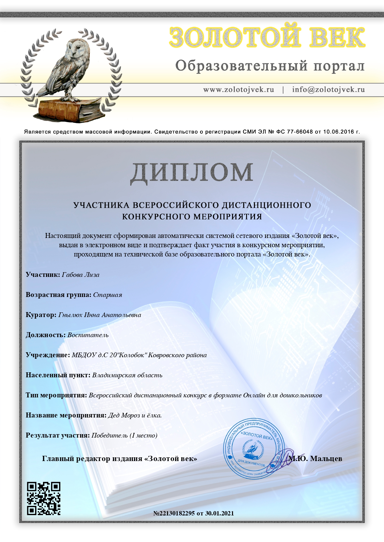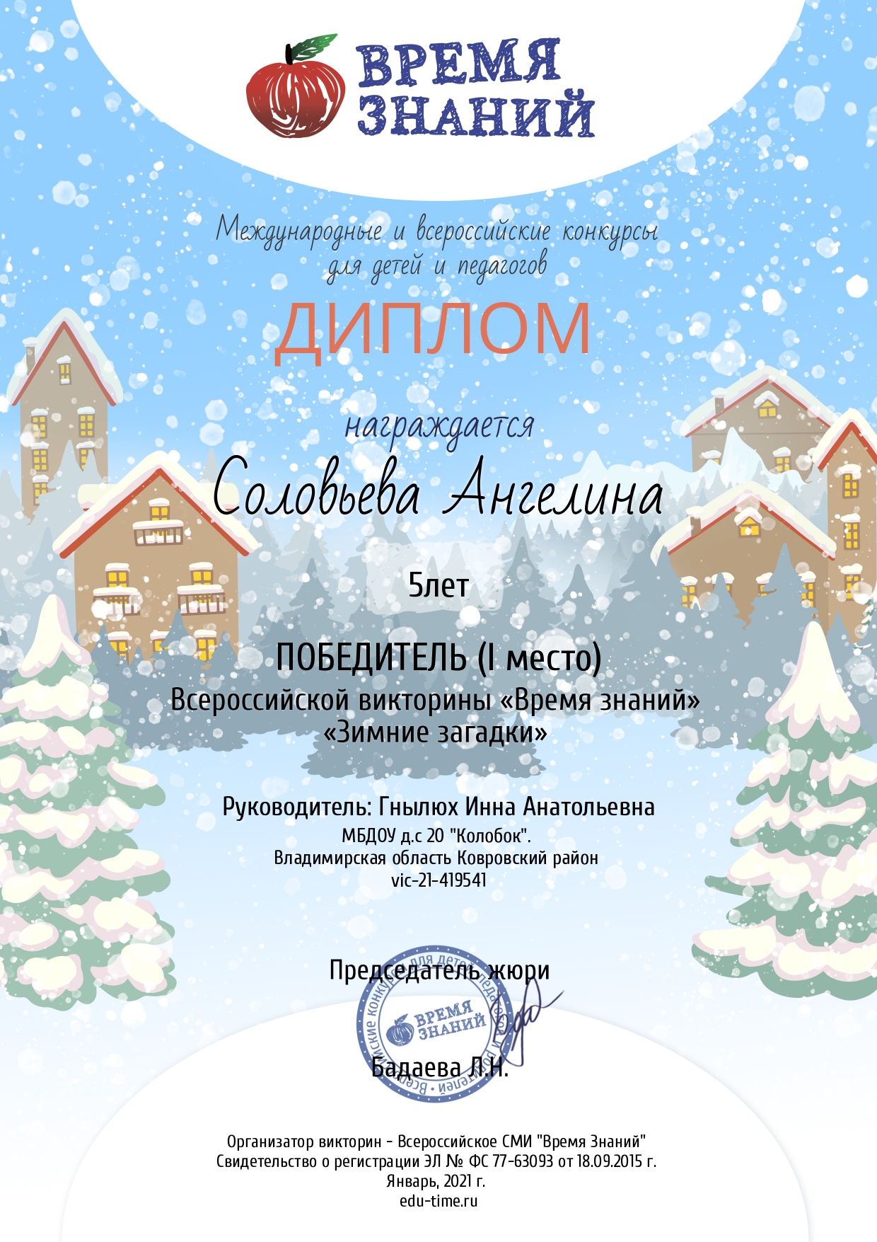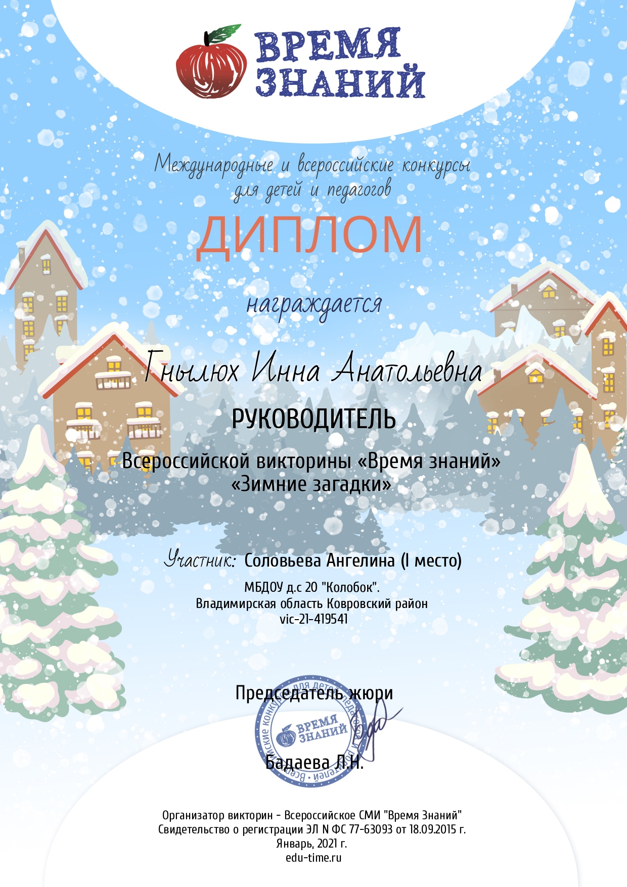 Новый 2021 год начался с ряда побед воспитанников МБДОУ детского сада №20 «Колобок». В январе месяце ребята и их родители, под чутким руководством воспитателей, принимали участие в различных онлайн-конкурсах, где стали призерами. Поздравляем Соловьеву Ангелину – воспитатель Гнылюх И.А., Игошину Дарью – воспитатель Сидорова В.В., Габову Елизавету – воспитатель Гнылюх И.А. и Мочалова Илью – воспитатель Сидорова В.В. с заслуженными победами.