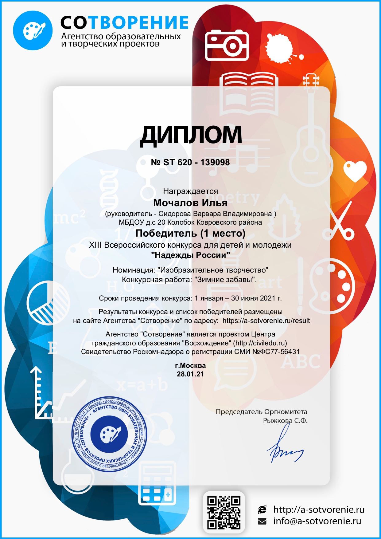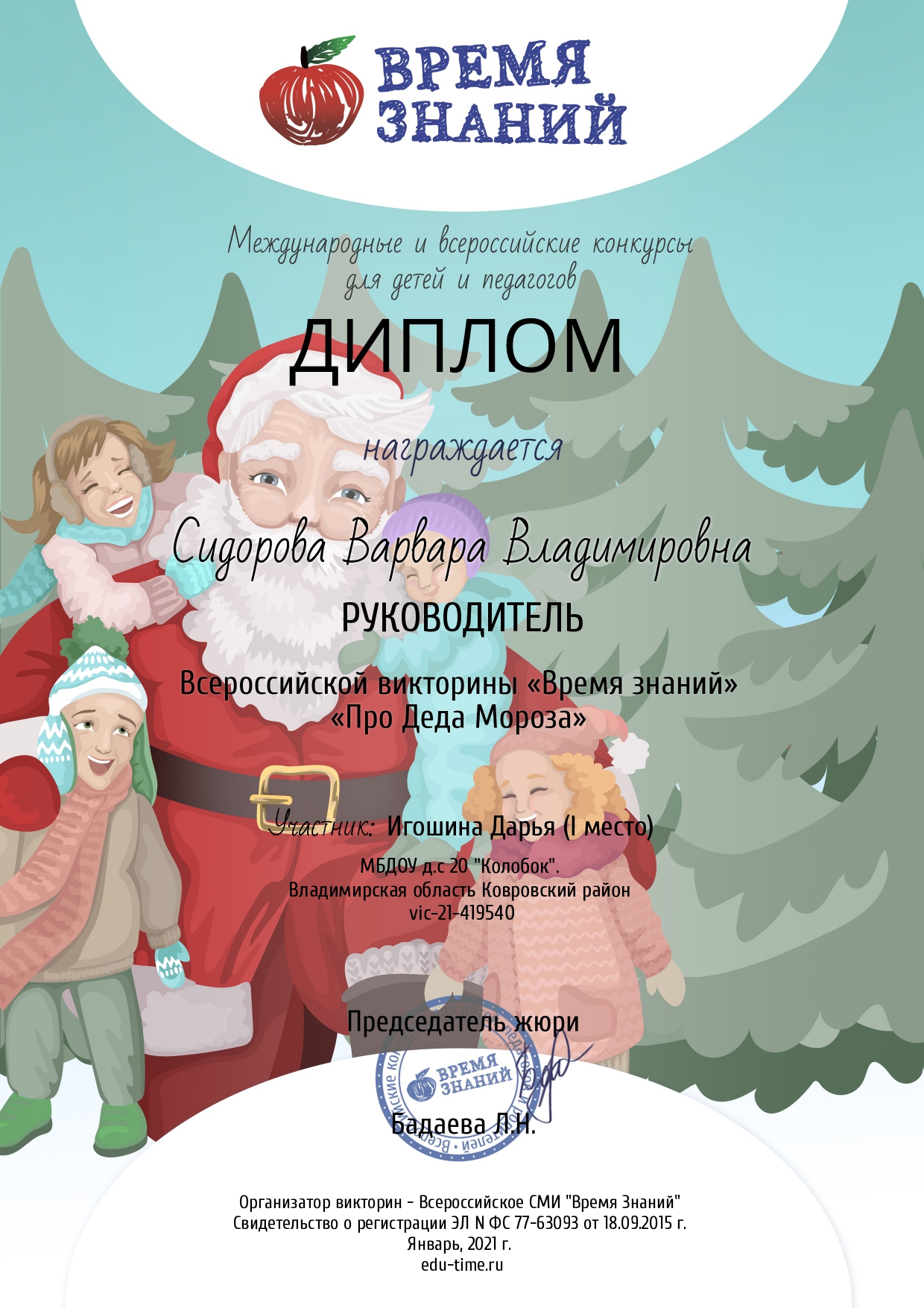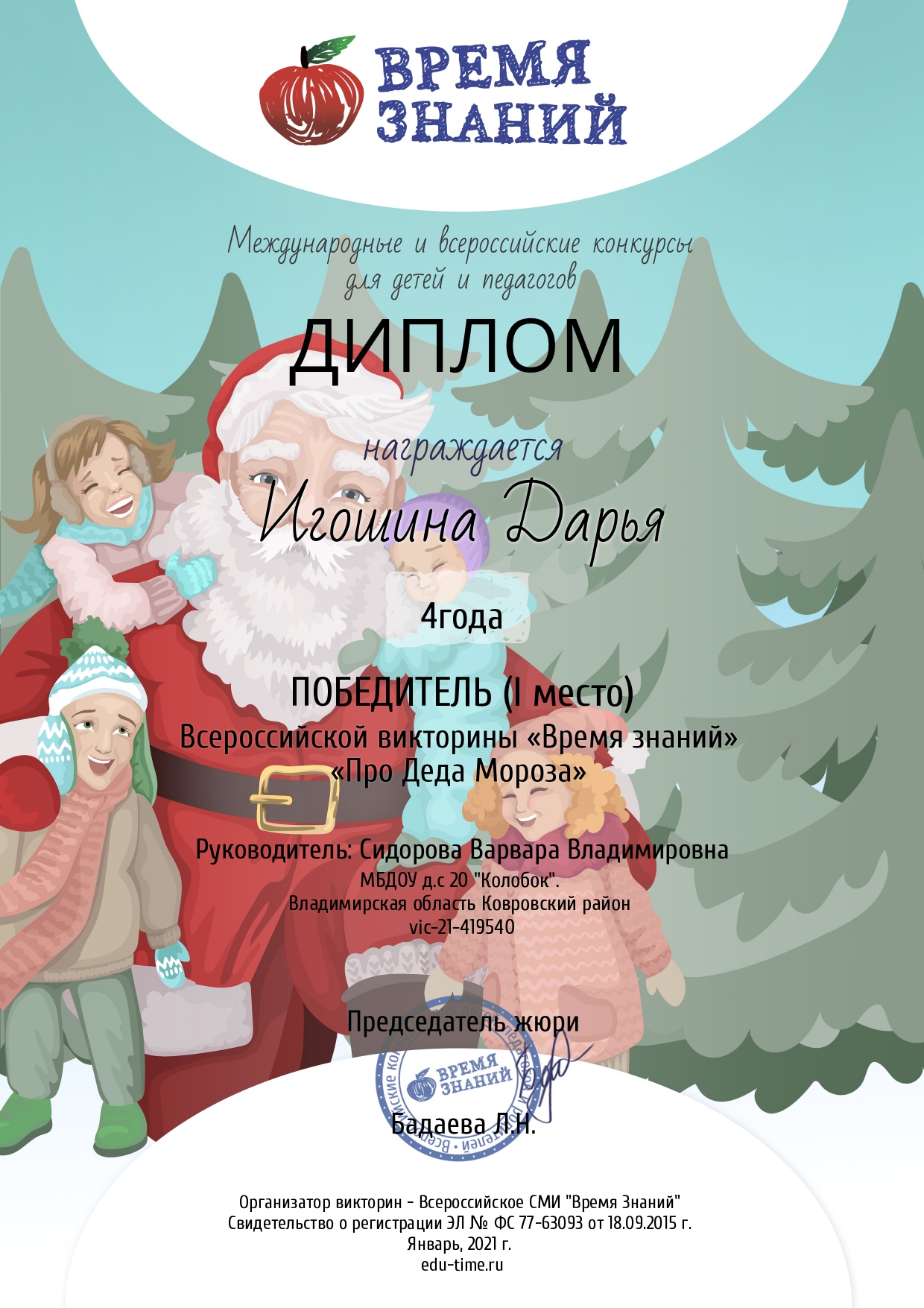 Новый 2021 год начался с ряда побед воспитанников МБДОУ детского сада №20 «Колобок». В январе месяце ребята и их родители, под чутким руководством воспитателей, принимали участие в различных онлайн-конкурсах, где стали призерами. Поздравляем Соловьеву Ангелину – воспитатель Гнылюх И.А., Игошину Дарью – воспитатель Сидорова В.В., Габову Елизавету – воспитатель Гнылюх И.А. и Мочалова Илью – воспитатель Сидорова В.В. с заслуженными победами.