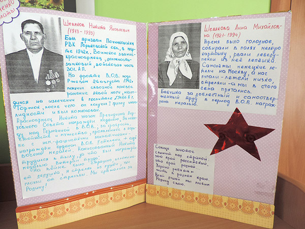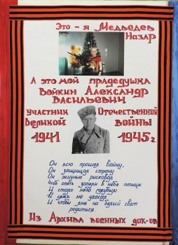 Есть события, над которыми не властно время, которые навсегда остаются в памяти народной, таким событием стала Великая Отечественная война, небывалая по своим масштабам, массовому героизму на полях сражений, лишениям, самоотверженному труду в тылу, и невыразимому трагизму. В нашем детском саду прошел конкурс семейных проектов «Великая Отечественная война в истории моей семьи». Победителями которого, стали: