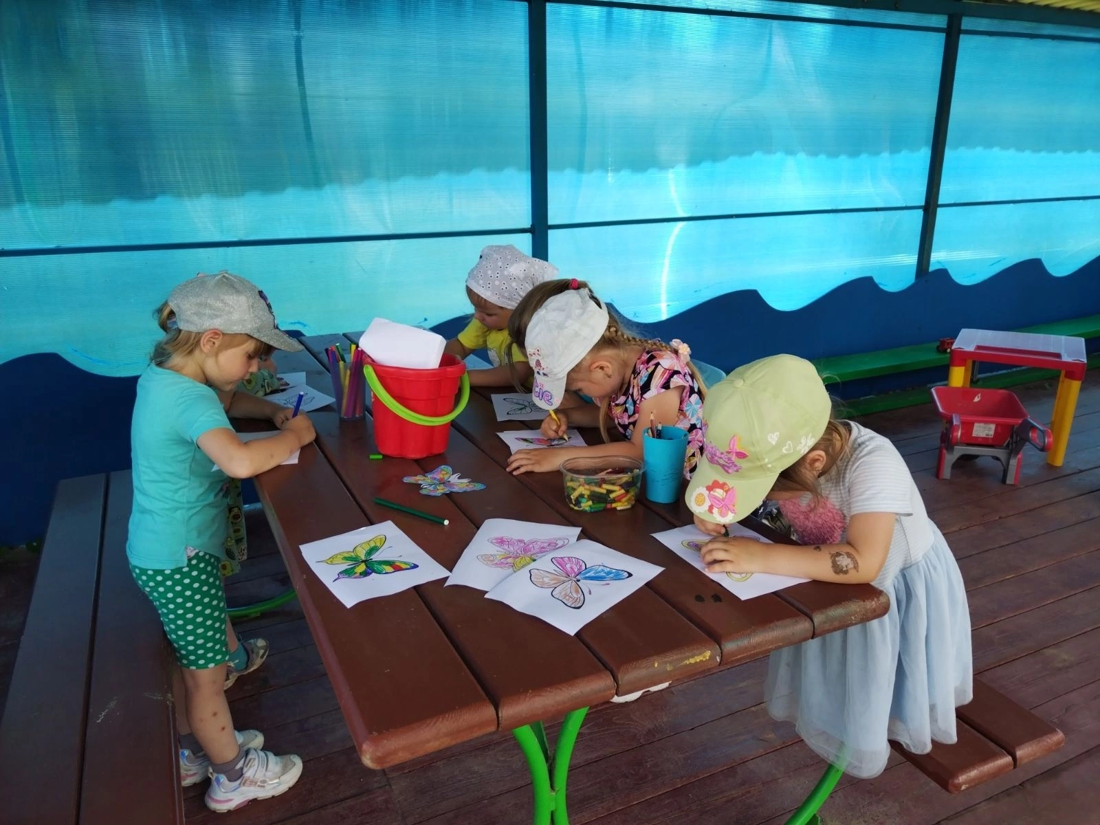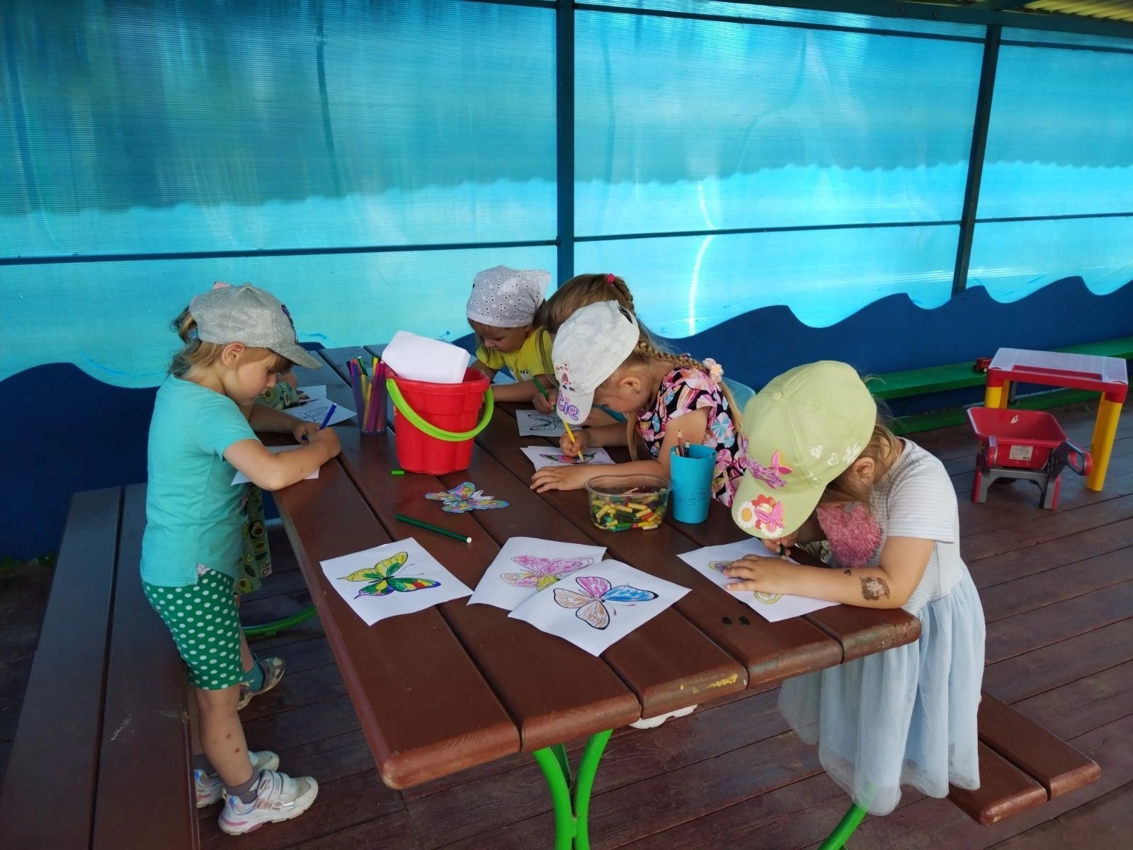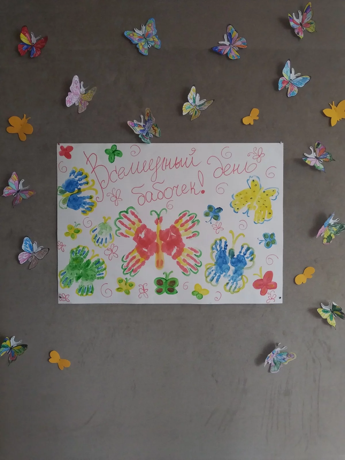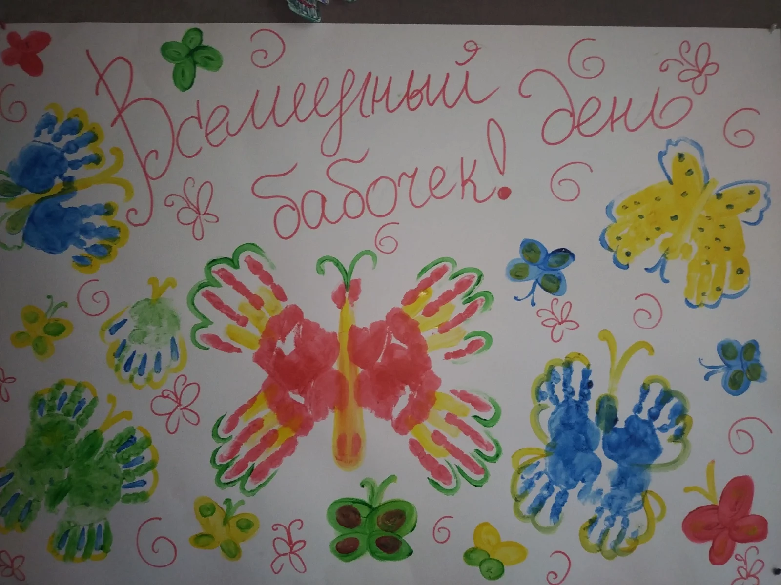 Сегодня - 19 июня - Всемирный день бабочек. Накануне мы с ребятами вовсю готовились: красили, вырезали, рисовали. Наши малыши с помощью своих ладошек создали нам чудесный плакат, а ребята постарше раскрасили и вырезали чудесных бабочек.