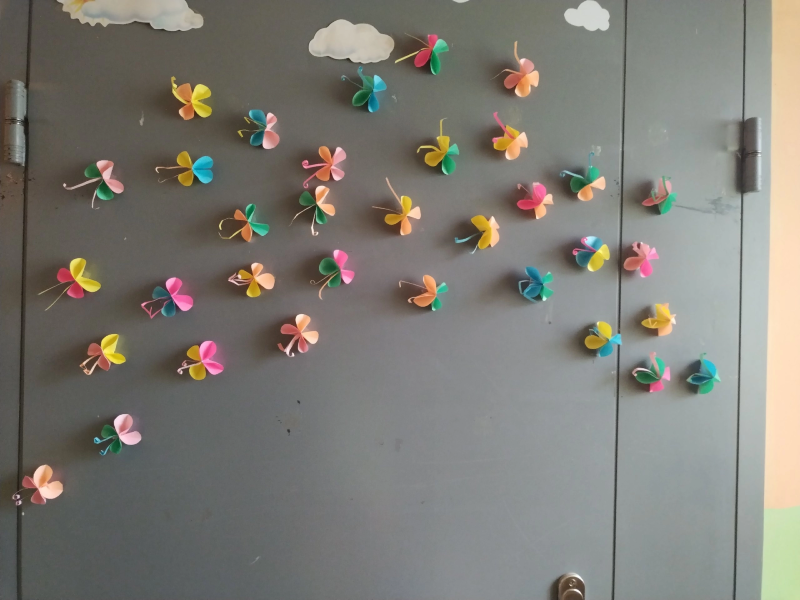 Сегодня из кружочков у нас получились прекрасные бабочки. И мы украсили ими дверь в приёмной. Полюбуйтесь!????