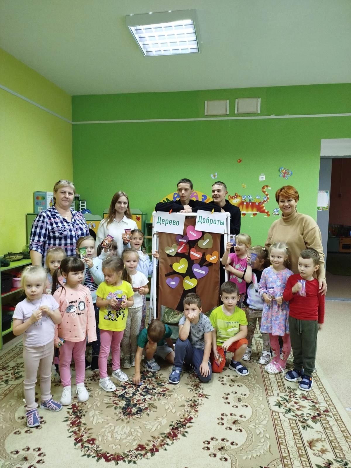 В рамках этой акции ребята провели для воспитанников группы «Почемучки» увлекательную игру «Вежливые загадки», в которой малыши вспомнили вежливые слова: здравствуйте, спасибо, доброе утро, спокойной ночи, приятного аппетита, до свидания. В процессе игры получилось удивительное «ДЕРЕВО ДОБРОТЫ». Праздник закончился танцами и гостинцами. Все остались довольны и ждут с нетерпением новых встреч.