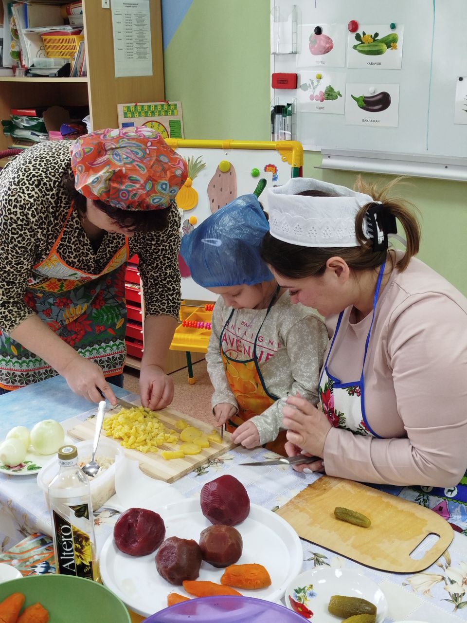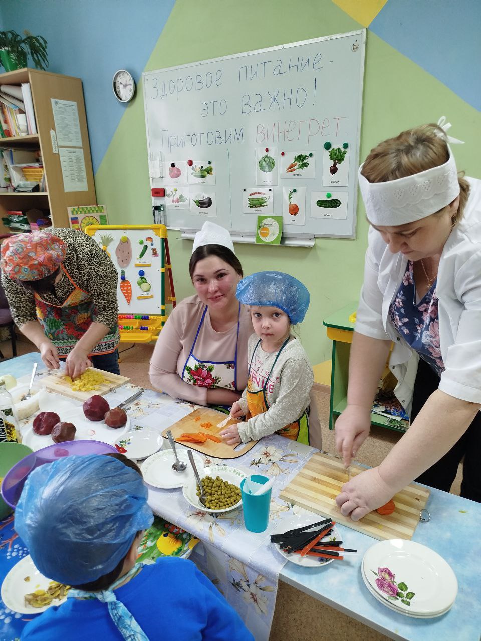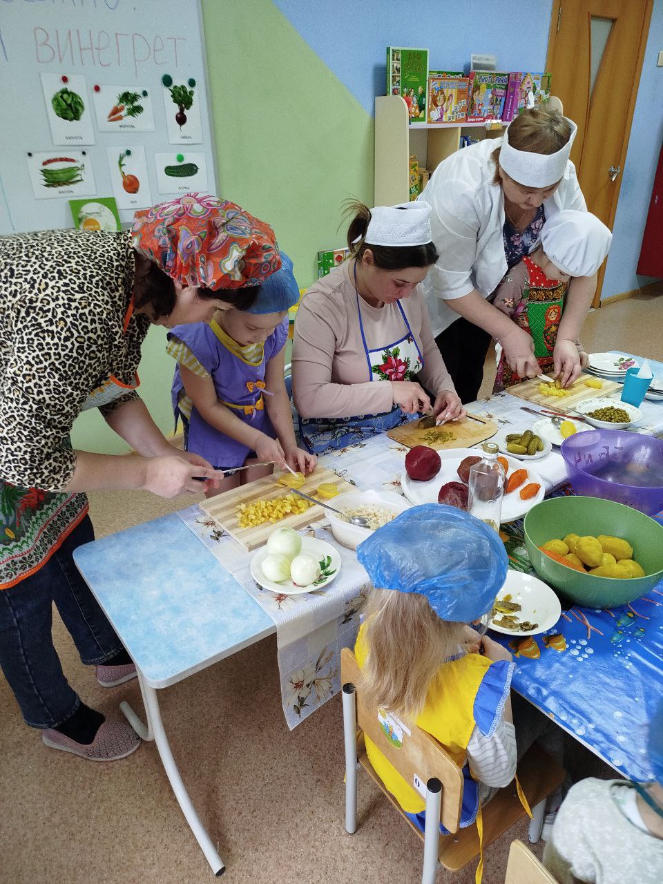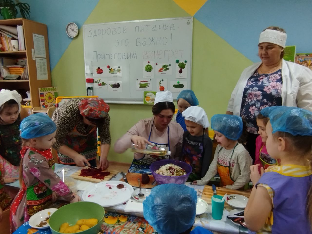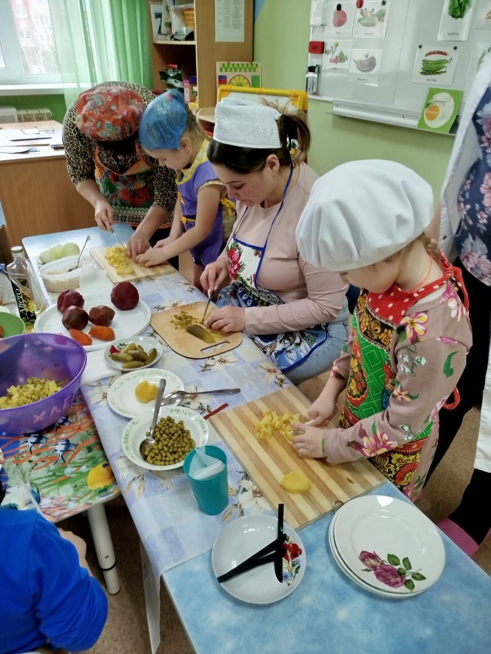 12 февраля в нашей группе "Почемучки " был проведён кулинарный мастер-класс по приготовлению винегрета. Задачи: закрепить названия овощей и продуктов, входящих в состав винегрета; продолжать учить ребят понимать смысл пословиц и поговорок, умение отгадывать загадки; формировать умение пользоваться ножом, нарезая овощи мелкими кусочками; воспитывать трудолюбие, аккуратность, желание доводить начатое дело до конца, помогая друг другу.