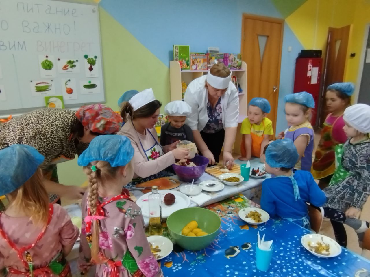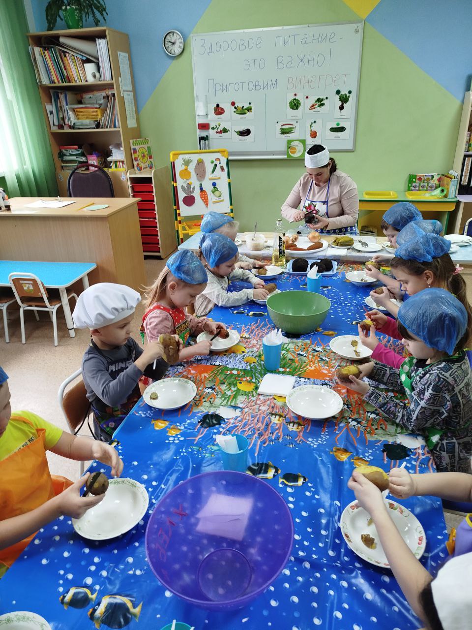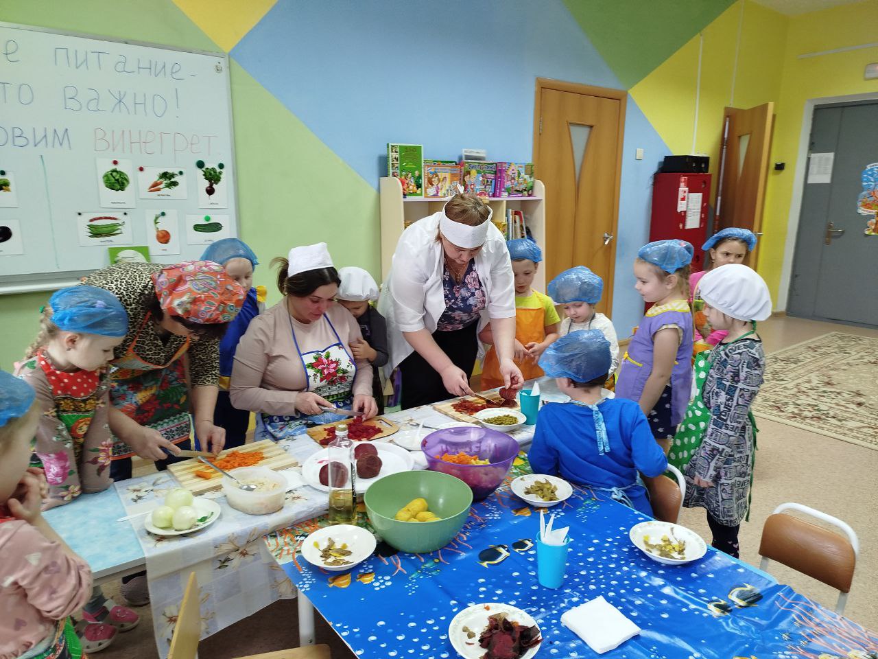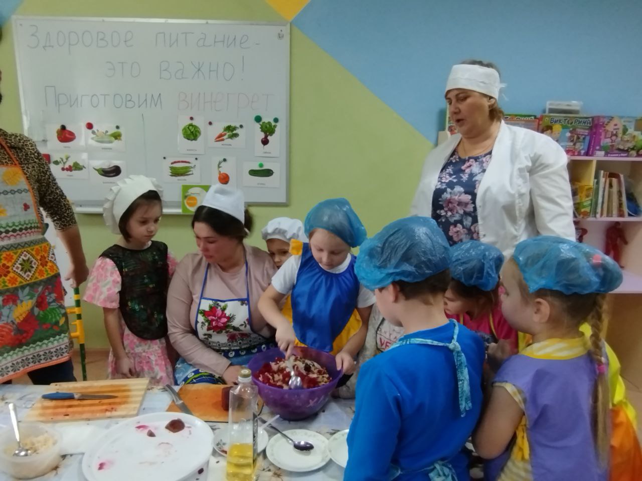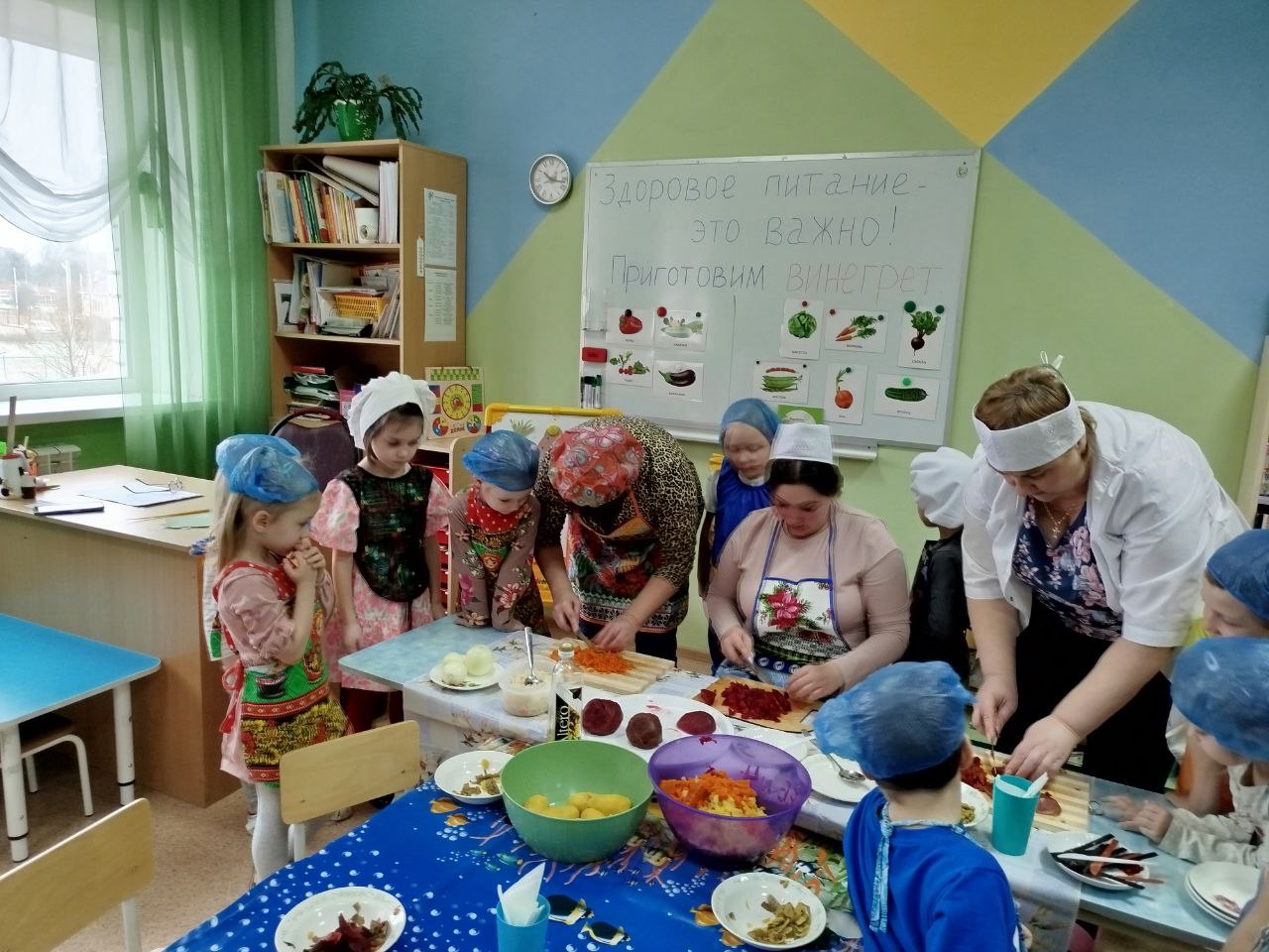 12 февраля в нашей группе "Почемучки " был проведён кулинарный мастер-класс по приготовлению винегрета. Задачи: закрепить названия овощей и продуктов, входящих в состав винегрета; продолжать учить ребят понимать смысл пословиц и поговорок, умение отгадывать загадки; формировать умение пользоваться ножом, нарезая овощи мелкими кусочками; воспитывать трудолюбие, аккуратность, желание доводить начатое дело до конца, помогая друг другу.