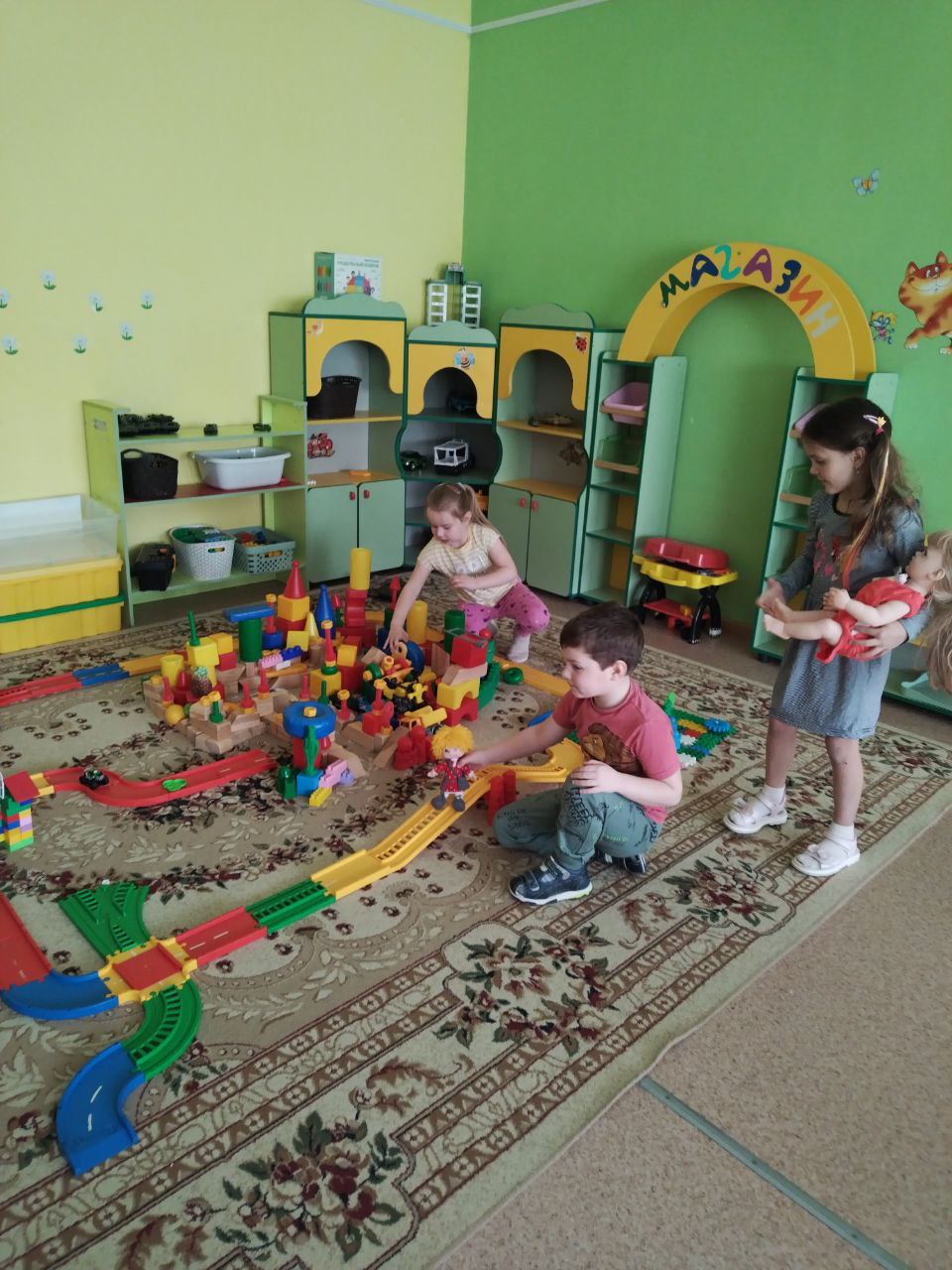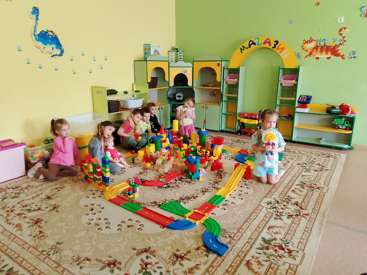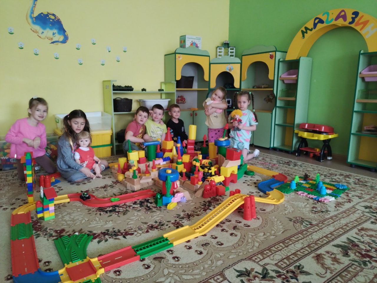 Сегодня ребята нашей группы "Почемучки" рано утром были очень удивлены, услышав шорох в построенном ими накануне городе. Оказалось, что у нас поселился Домовенок Кузя. Ребята с увлечением знакомили Кузю с достопримечательности своего города во время пешеходной прогулки. Делали с Домовенком зарядку, разучивали новые буквы и писали их. Очень увлечённо ребята слушали рассказы про Кузю из книги Татьяны Александровой. Кузя решил остаться жить в построенном ребятами городе.
