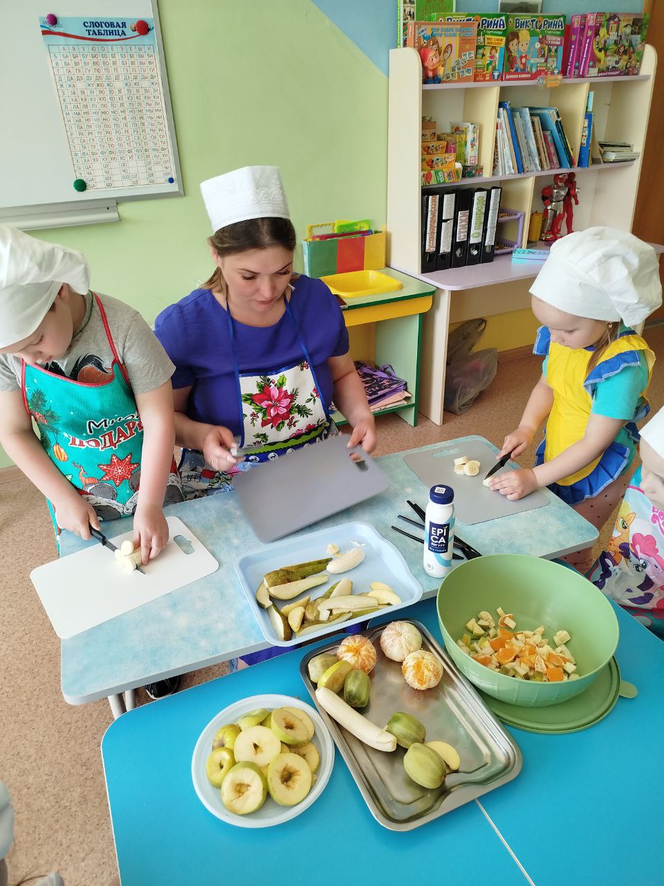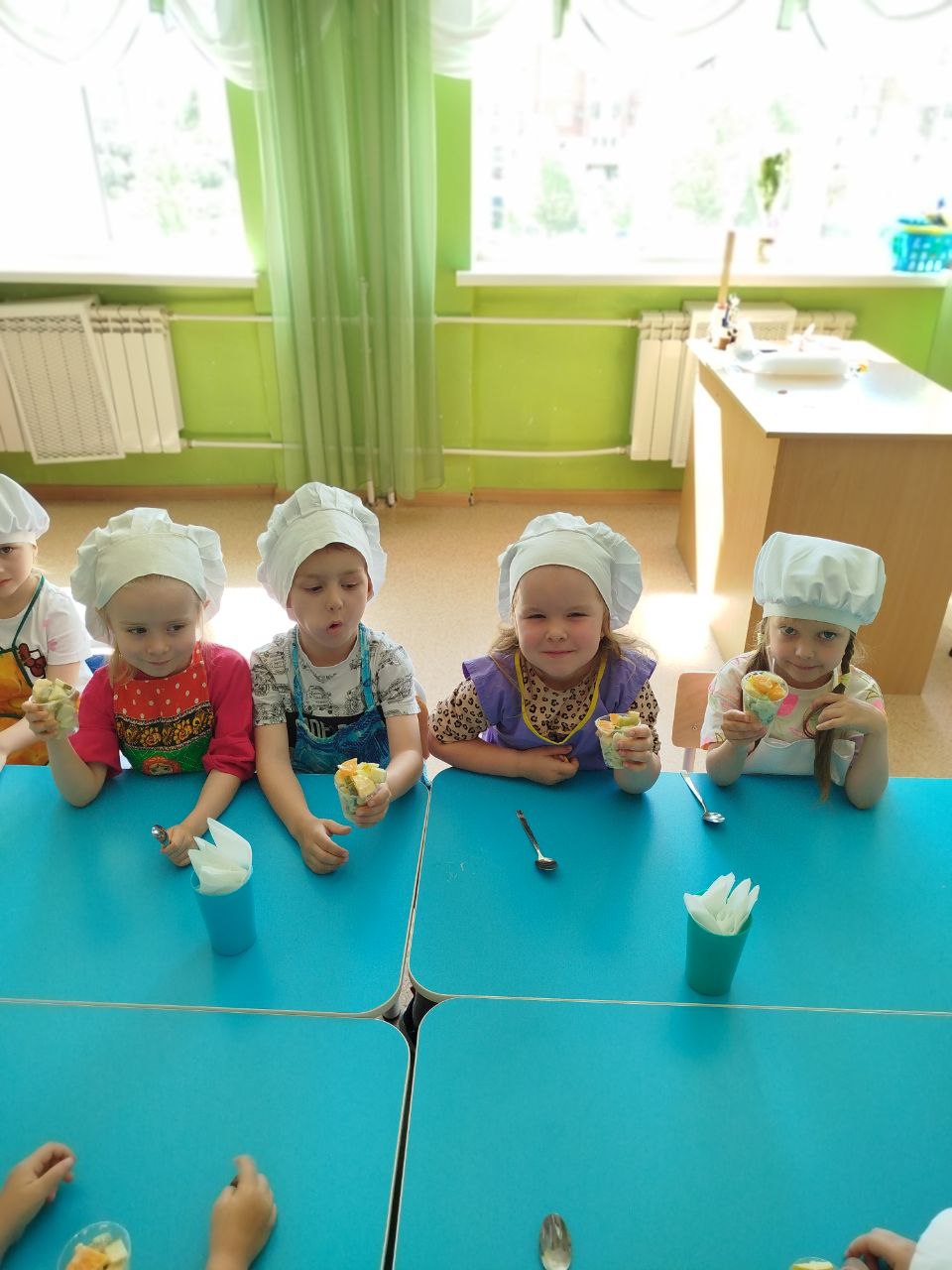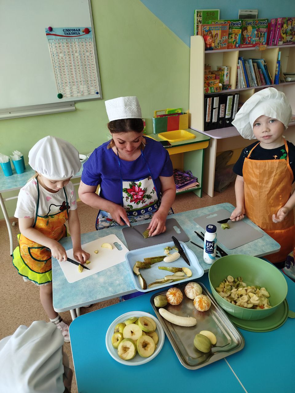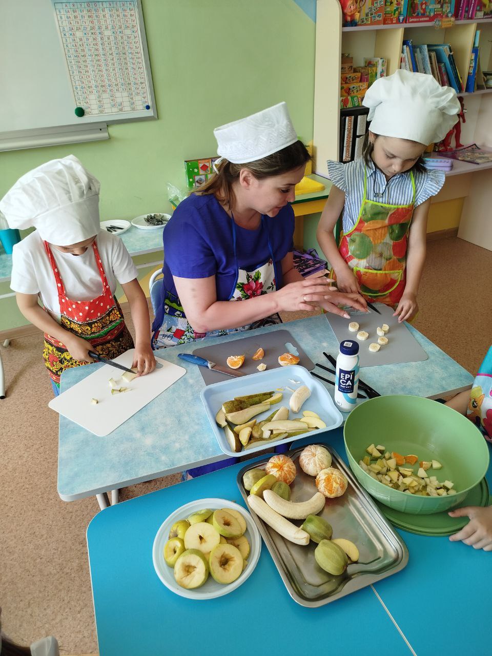 27 мая в группе № 4 Ольгой Алексеевной Скородумовой был проведён кулинарный мастер-класс "Что такое витамины и где они живут?" по приготовлению витаминного фруктового салата. Перед приготовлением салата дети тщательно вымыли руки, оделись как настоящие повара - в поварские колпаки и фартуки и приступили к работе. Дети резали под контролем Ольги Алексеевны: сначала "рука в руке", а затем самостоятельно. В процессе приготовления салата ребята узнали о полезных свойствах фруктов. Дети с большим нетерпением ждали, когда же приготовится салат и его можно будет пробовать. И вот, соединив все ингредиенты: бананы, киви, яблоки, мандарины, груши, добавив йогурт, можно приступать к дегустации. Ребята остались очень довольны собой, что научились готовить фруктовый салат и теперь смогут и дома помочь приготовить вкусное и полезное блюдо. Будьте здоровы!