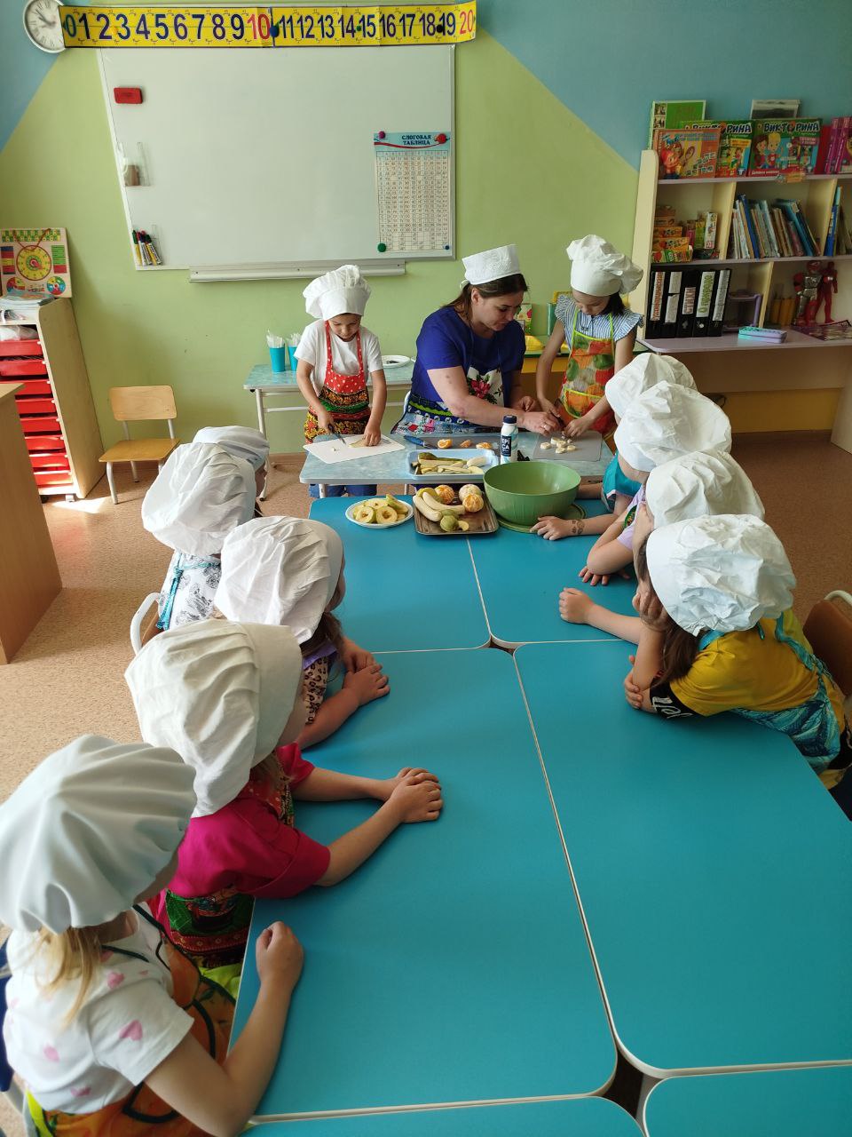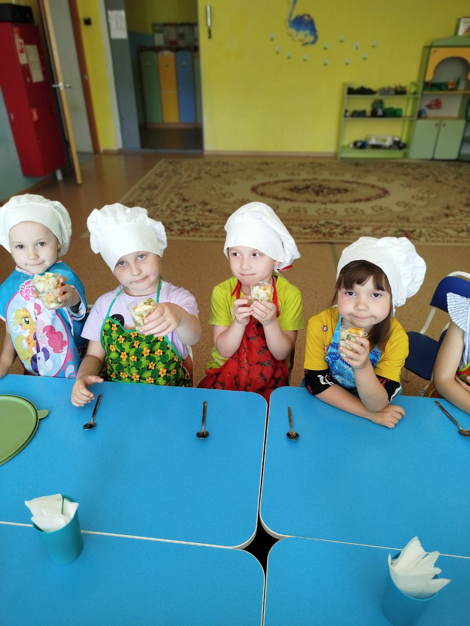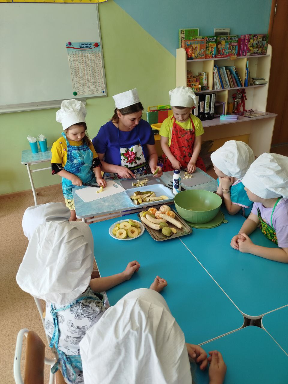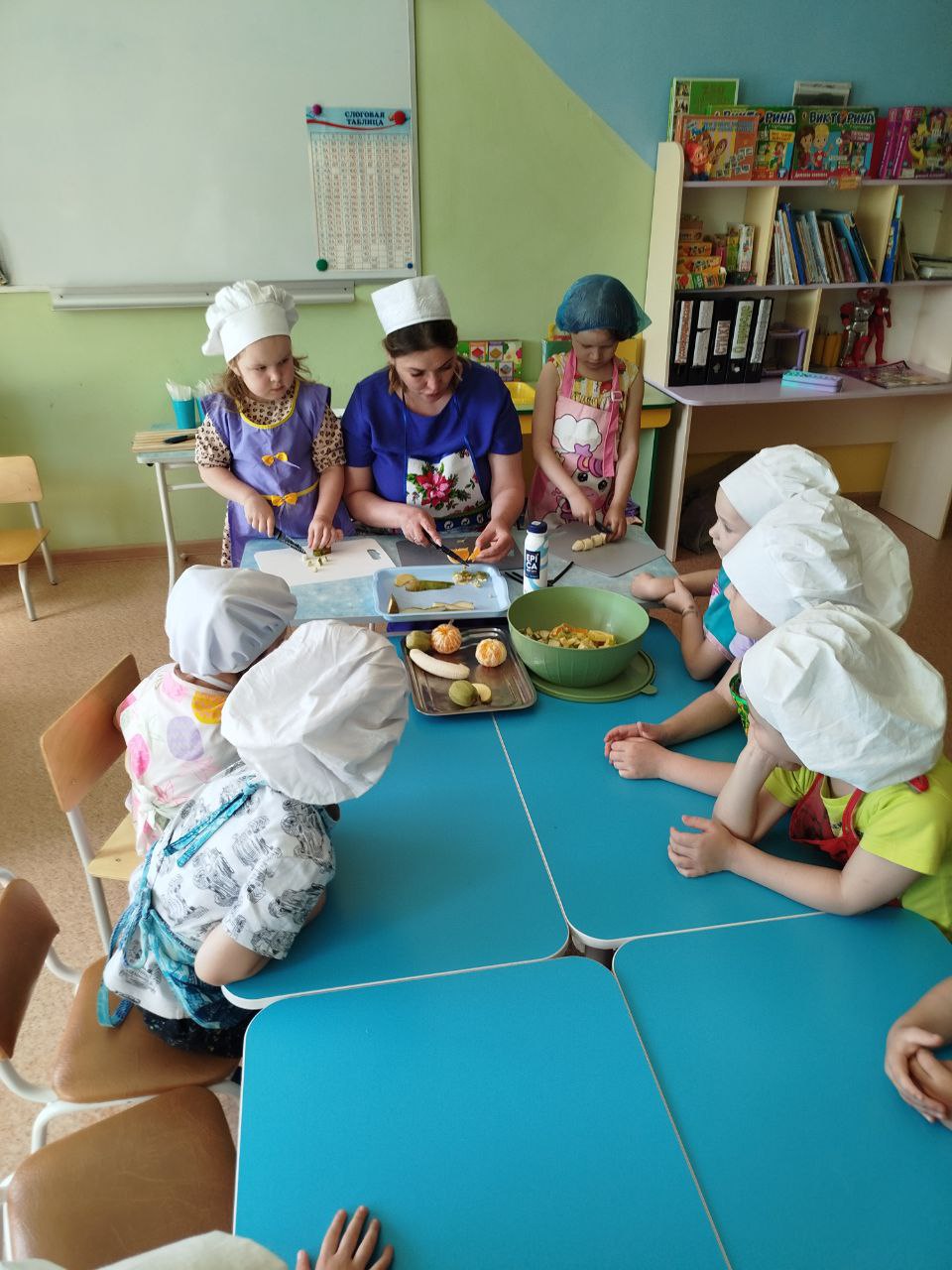 27 мая в группе № 4 Ольгой Алексеевной Скородумовой был проведён кулинарный мастер-класс "Что такое витамины и где они живут?" по приготовлению витаминного фруктового салата. Перед приготовлением салата дети тщательно вымыли руки, оделись как настоящие повара - в поварские колпаки и фартуки и приступили к работе. Дети резали под контролем Ольги Алексеевны: сначала "рука в руке", а затем самостоятельно. В процессе приготовления салата ребята узнали о полезных свойствах фруктов. Дети с большим нетерпением ждали, когда же приготовится салат и его можно будет пробовать. И вот, соединив все ингредиенты: бананы, киви, яблоки, мандарины, груши, добавив йогурт, можно приступать к дегустации. Ребята остались очень довольны собой, что научились готовить фруктовый салат и теперь смогут и дома помочь приготовить вкусное и полезное блюдо. Будьте здоровы!