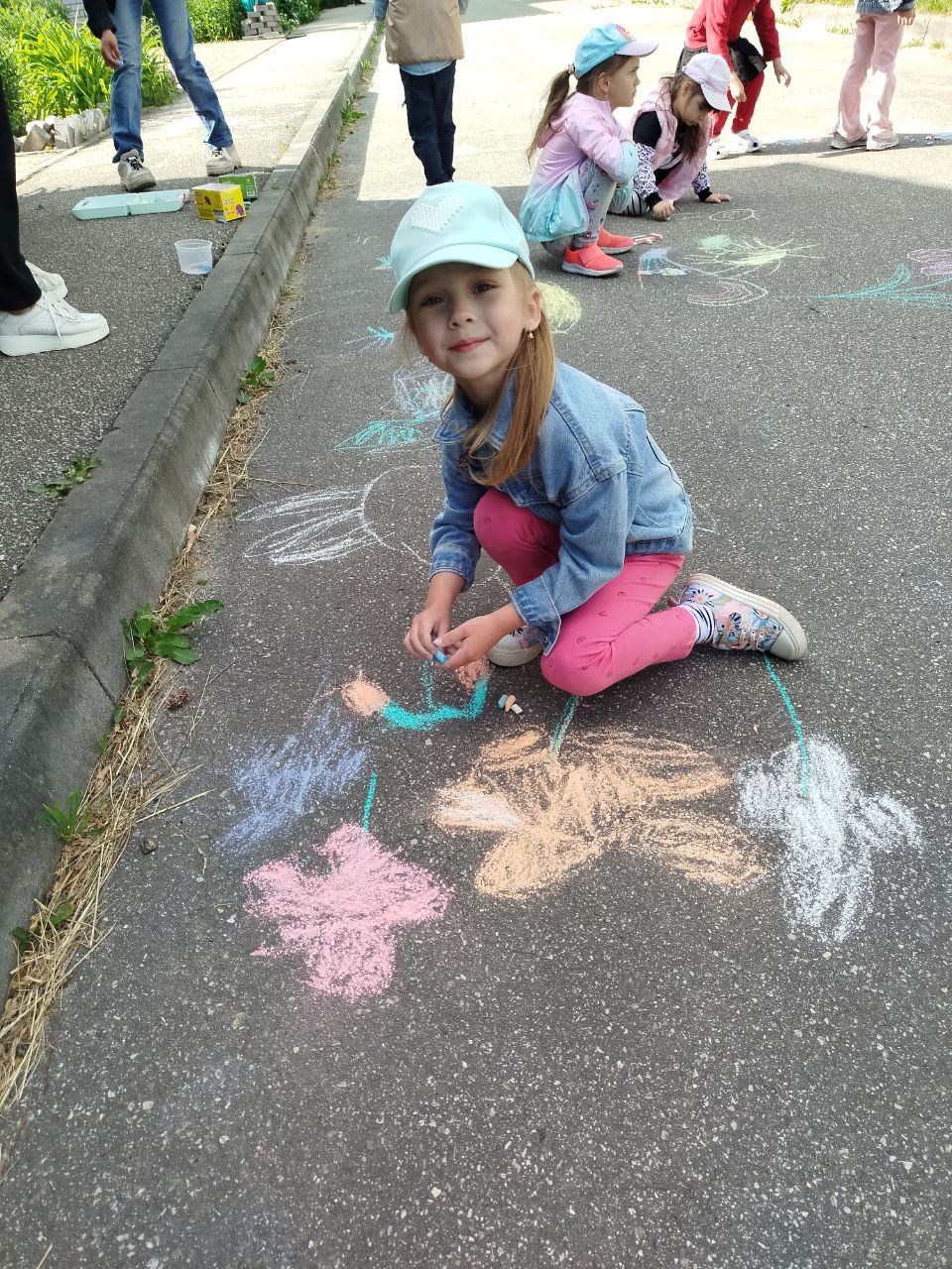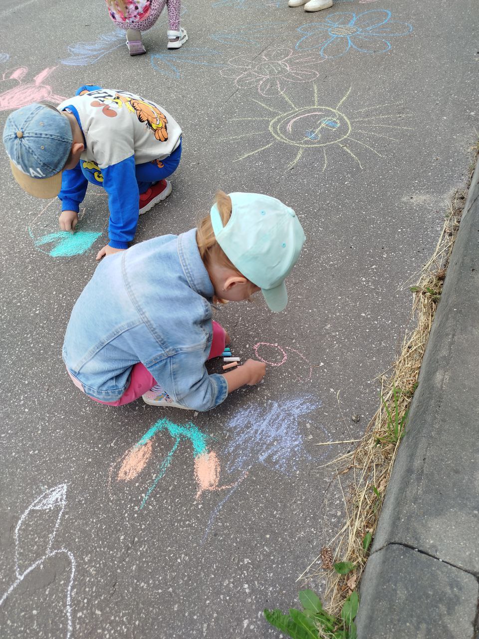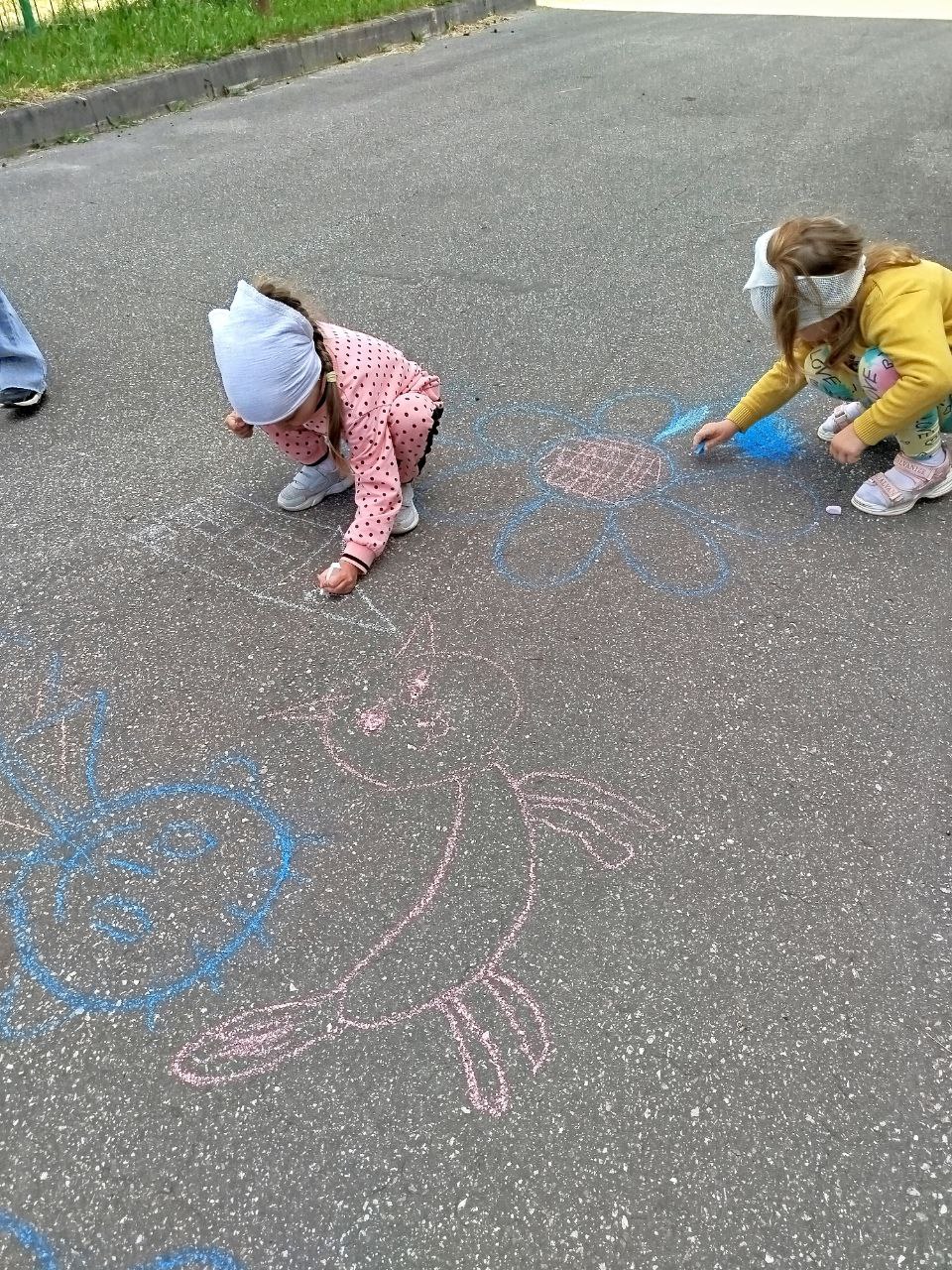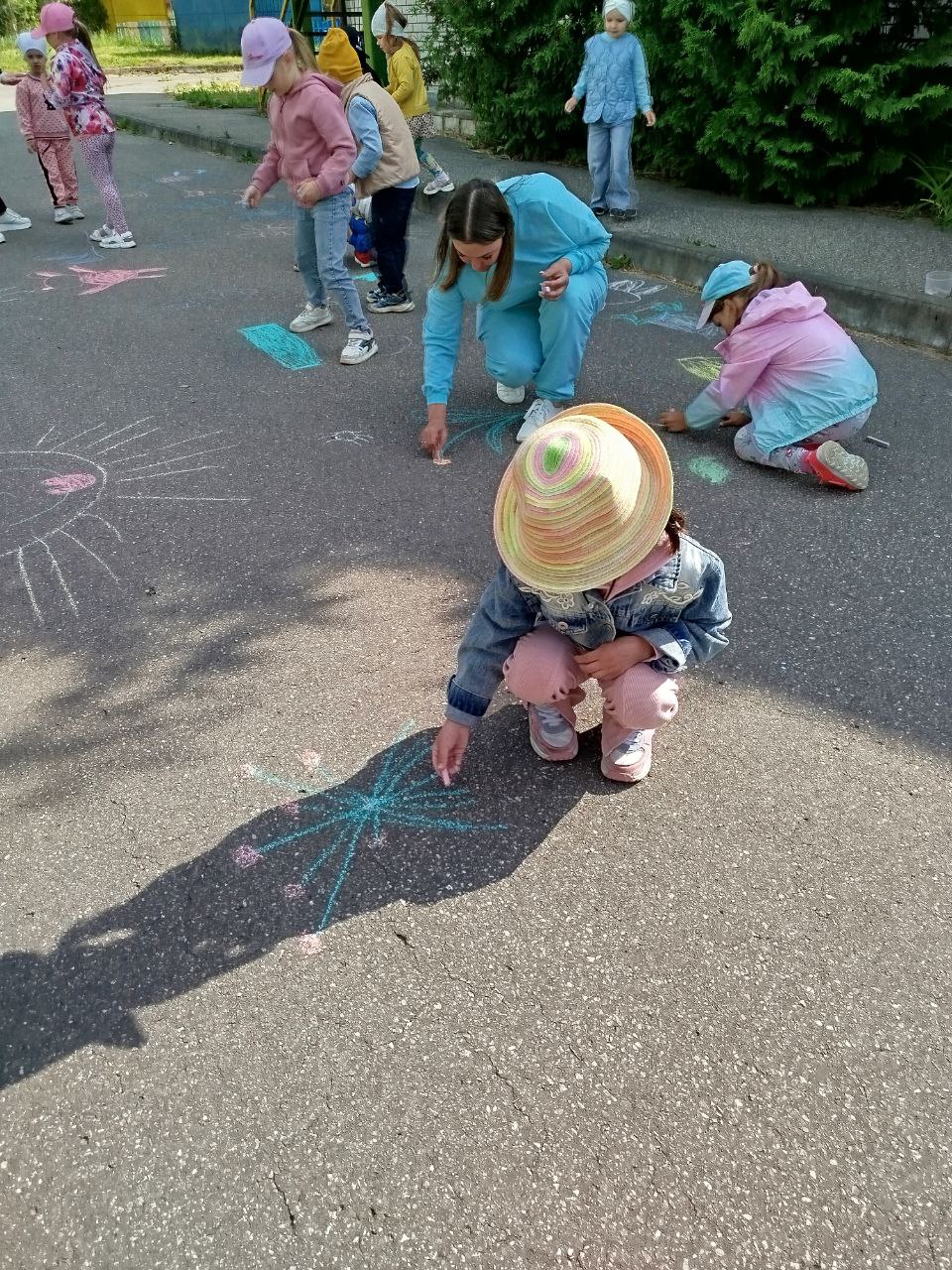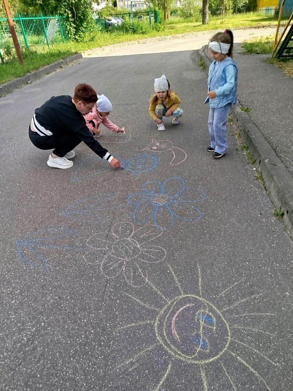 Мы с ребятами интересно провели время: отгадывали загадки; играли в игры на асфальте: "Пойдём по дорожке", "Перепрыгни через реку". Дети развивали своё творческое воображение, создавая красочные рисунки на асфальте с помощью мелков: пейзажи, животных, предметы. Ребята получили радость от собственных "шедевров", хорошее настроение, веселье и массу позитива.