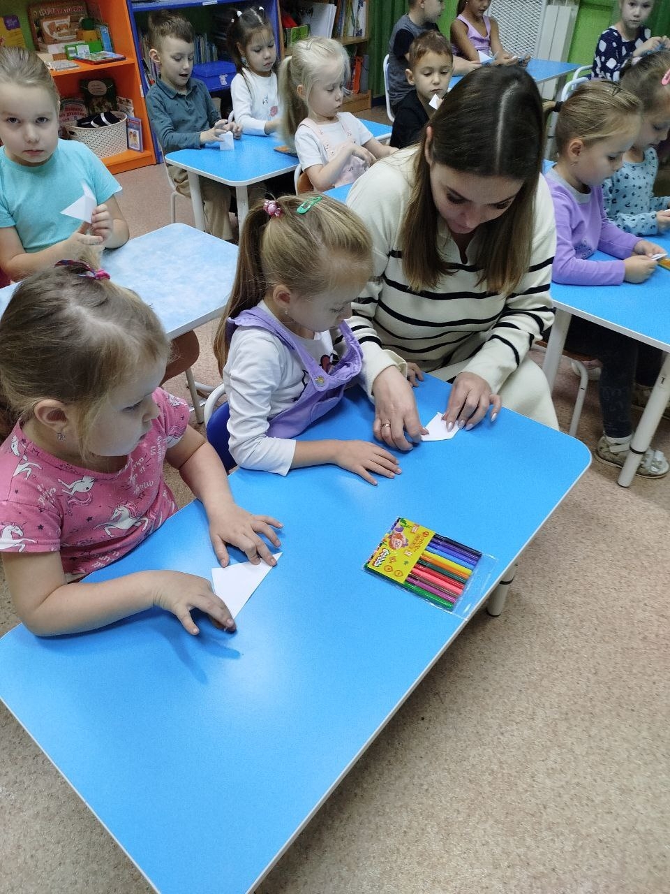 Ребята группы № 4 с Ольгой Алексеевной Скородумовой продолжили путешествие по стране оригами и изготовили закладку для книги "Котик". Закладка хоть и небольшая, но очень полезная вещь при чтении книг. С её помощью удобнее читать и находить нужную страницу. И в то же время она способствует воспитанию культуры обращения с книгами. Ольга Алексеевна показала образцы закладок - котиков и объяснила, как их сделать. В ходе изготовления дети проявили творчество, фантазию, воображение. Закладки получились красивые и яркие. Если в книжке есть закладка, то и книжка в порядке и дольше служит читателям. Теперь эти помощники будут жить в наших книгах. Спасибо большое Ольге Алексеевне за увлекательное путешествие в страну оригами.