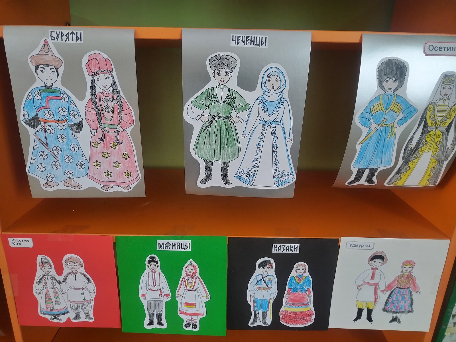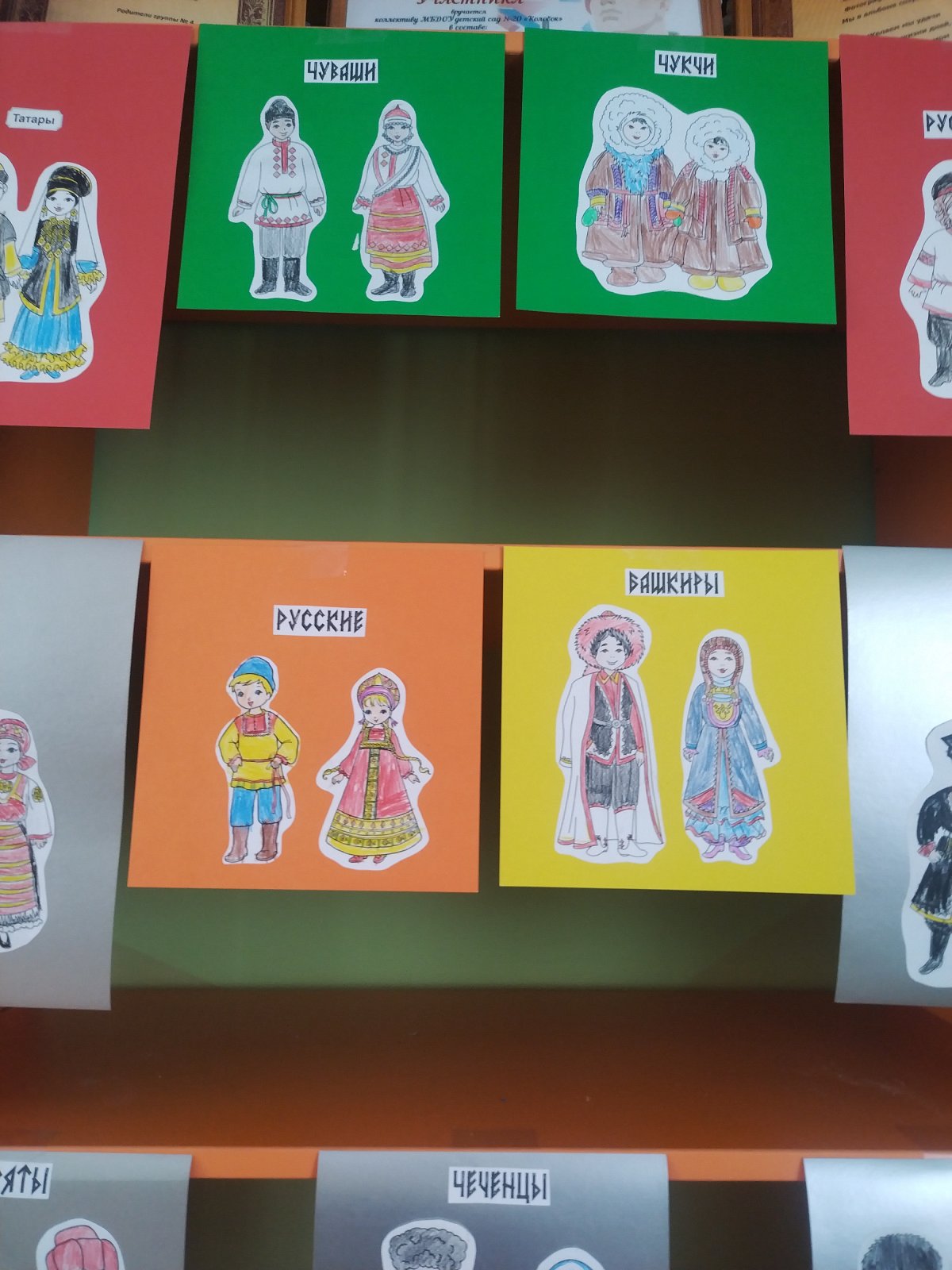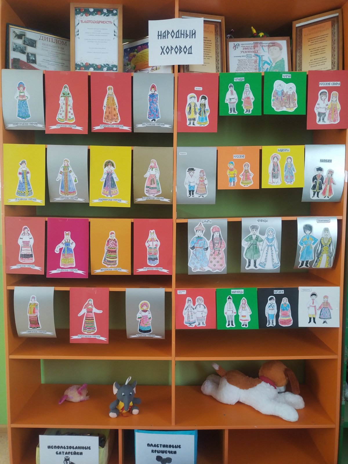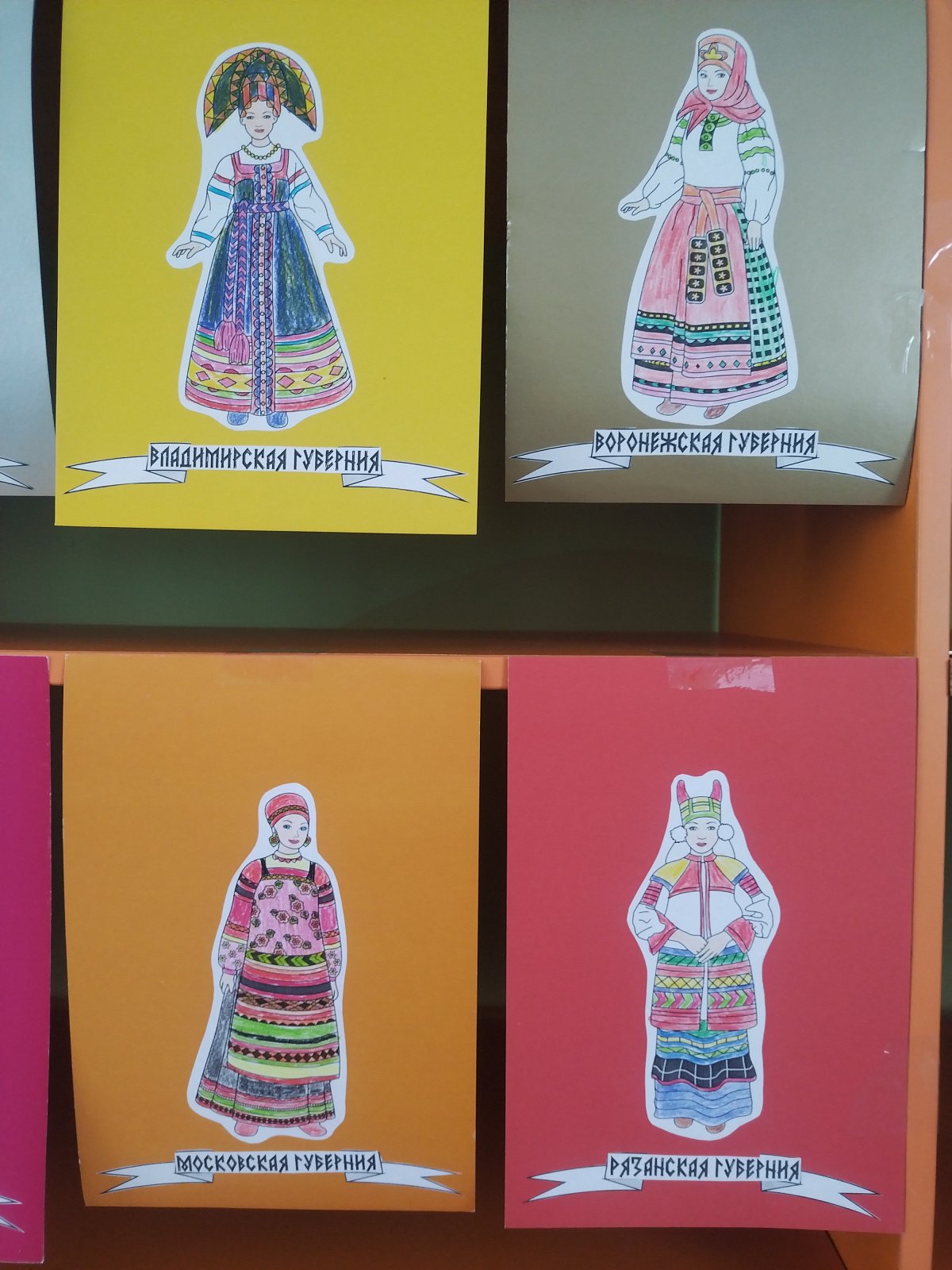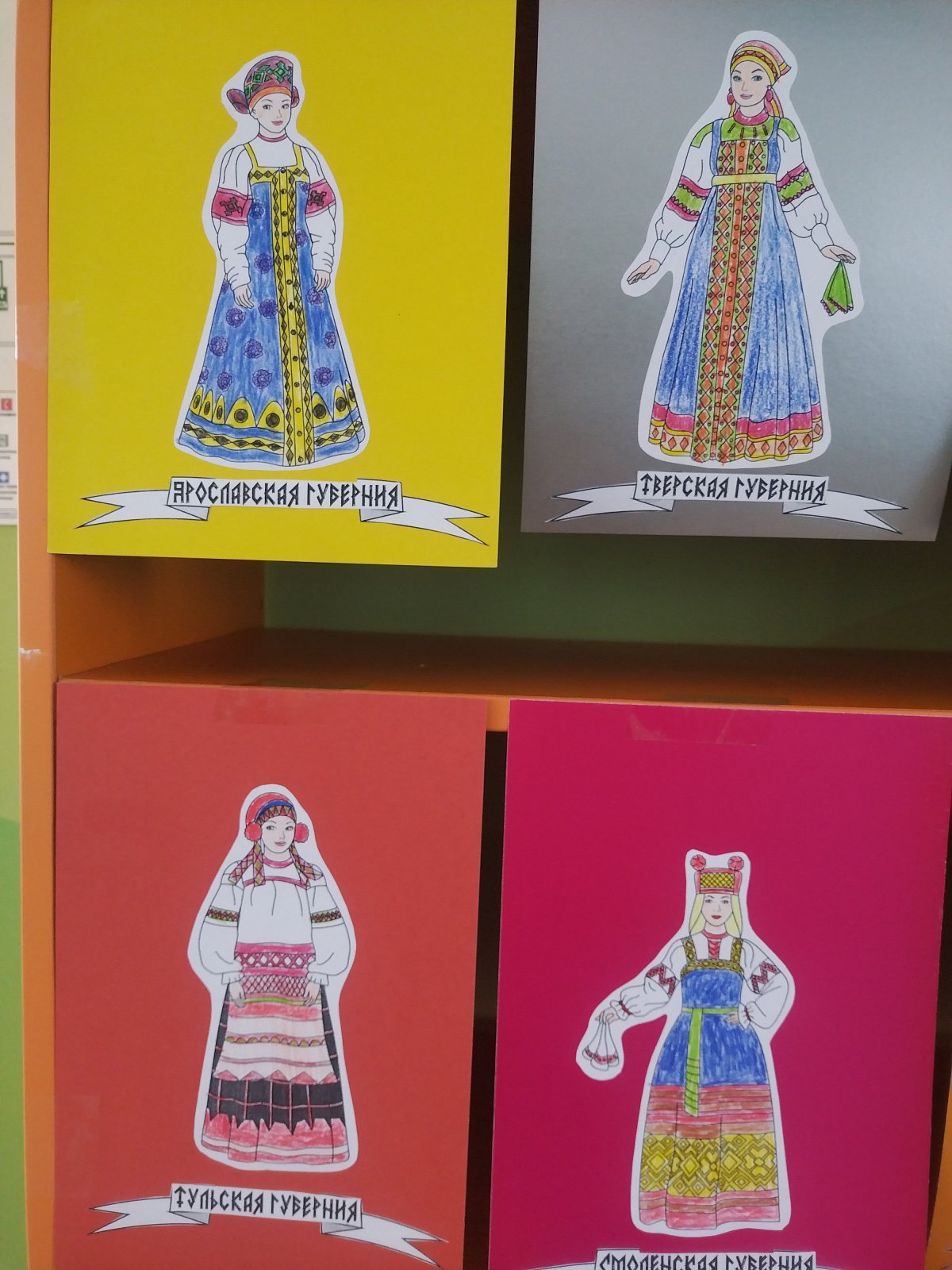 Мы с ребятами 3 и 4 групп завели "Народный хоровод" : раскрасили и собрали на выставку не только национальные костюмы народов России, но и наряды разных русских губерний. Вы найдёте здесь и нашу Владимирскую губернию. Полюбуйтесь на разнообразие форм и красок в холле второго этажа детского сада" Колобок".