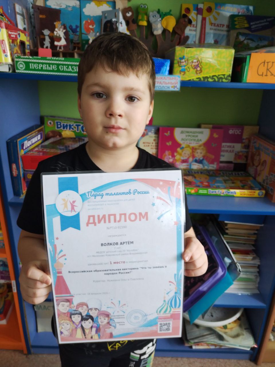 Ребята группы "Почемучки" активно знакомятся с народами России и даже участвуют в викторинах. И один из наших воспитанников - Артём Волков - занял 1 место во Всероссийской образовательной викторине "Что ты знаешь о народах России?"