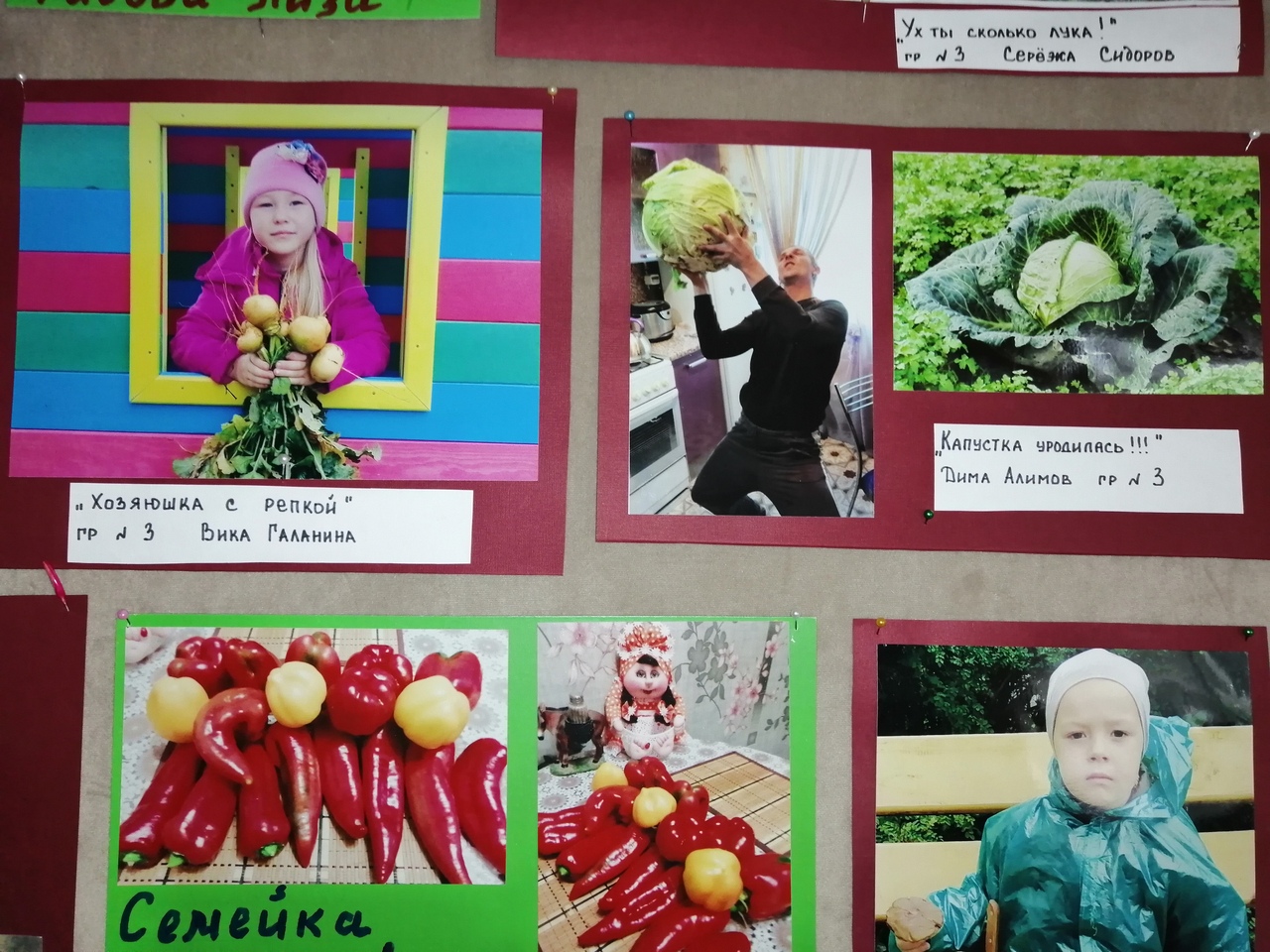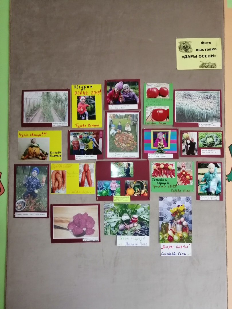 На нашем обновленном стенде, стараниями наших воспитанников и их родителей, теперь организована фотовыставка под названием "Дары осени"! У каждого была возможность похвалиться всем, что щедрая Осень принесла в огороды, леса и сады. И вы приходите посмотреть! Вот так урожай!